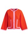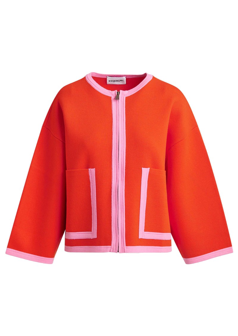 The Essentiel Antwerp Jani Jacket is a sleek, collarless design featuring a vibrant nectarine base with contrasting pink edging, a central zip closure, a square boxy fit, and oversized front patch pockets for a bold, modern look.