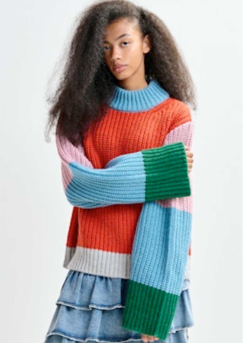 The Essentiel Antwerp Jant is a multicoloured ribbed knit with a relaxed, oversized fit, featuring a rounded neckline and dropped shoulder seams for a cosy, effortlessly stylish look.