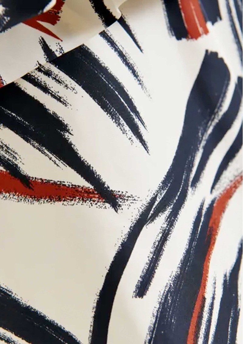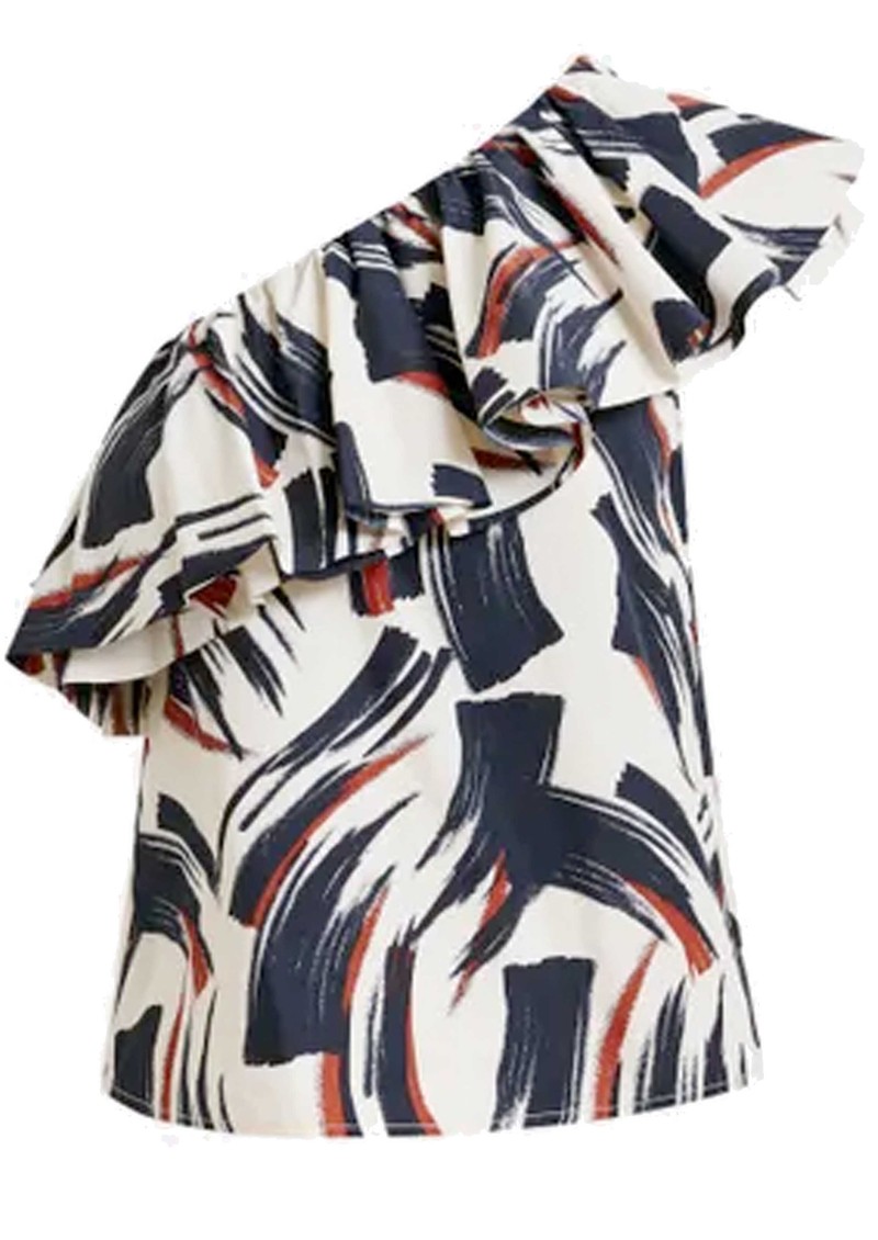 Make a bold statement with the Essentiel Antwerp Jillian Asymmetric Ruffle Top - an abstract red and pink printed top featuring a dramatic ruffle sweeping across the shoulder and front for a striking, contemporary silhouette.