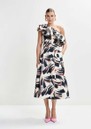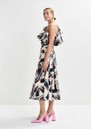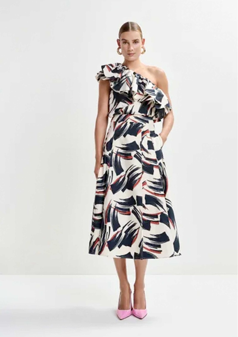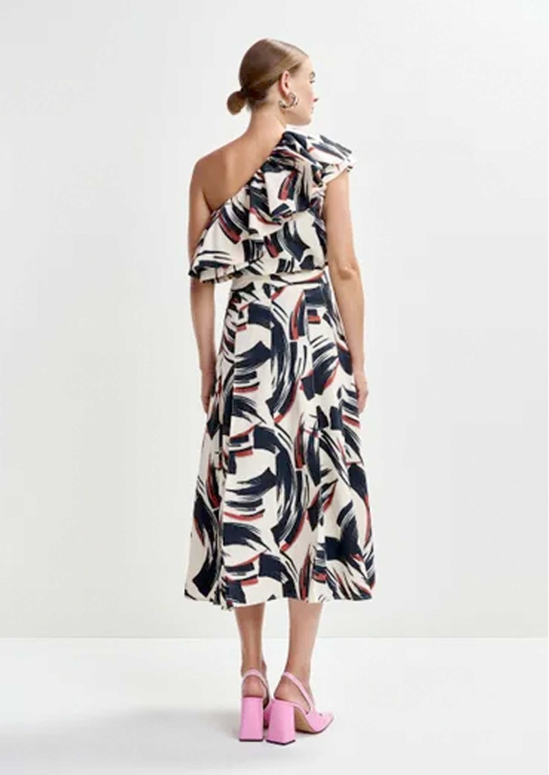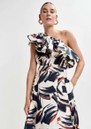 - Asymmetric ruffle across shoulder and front