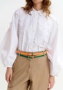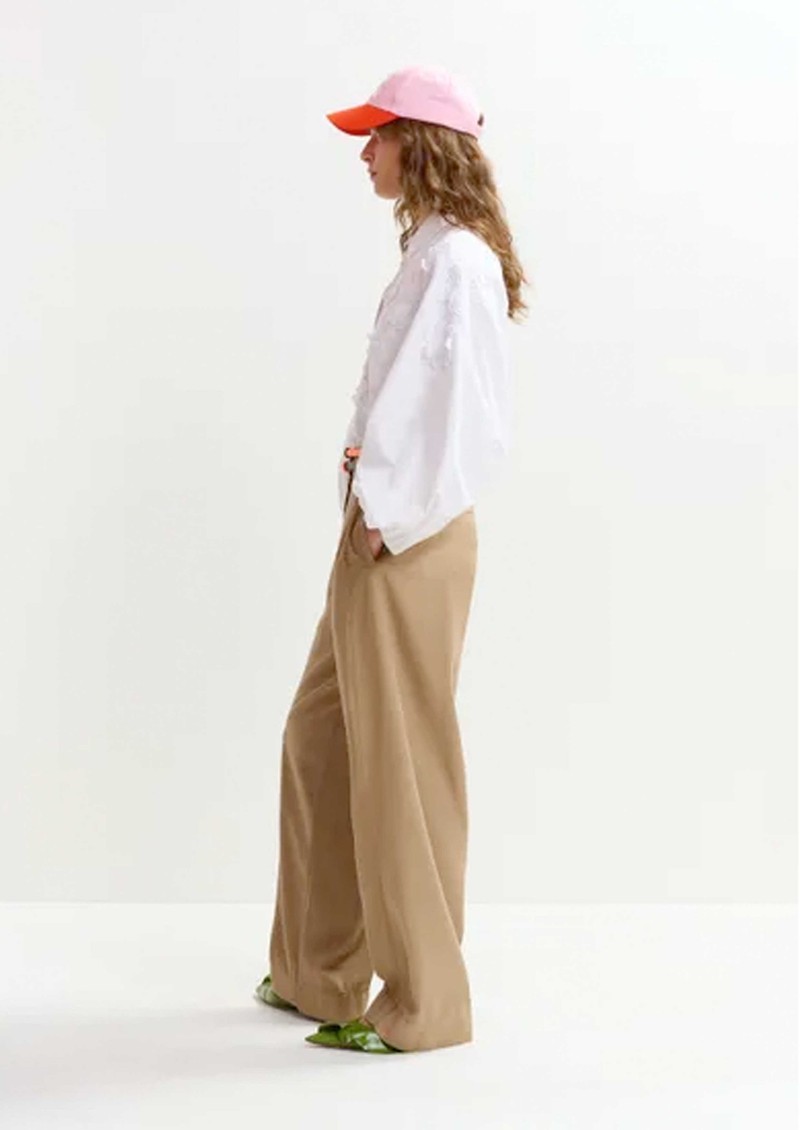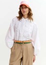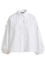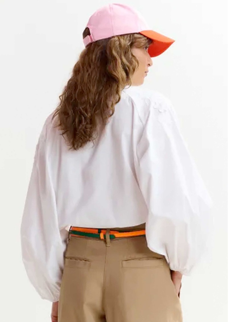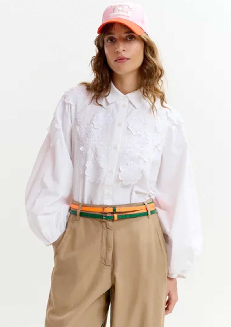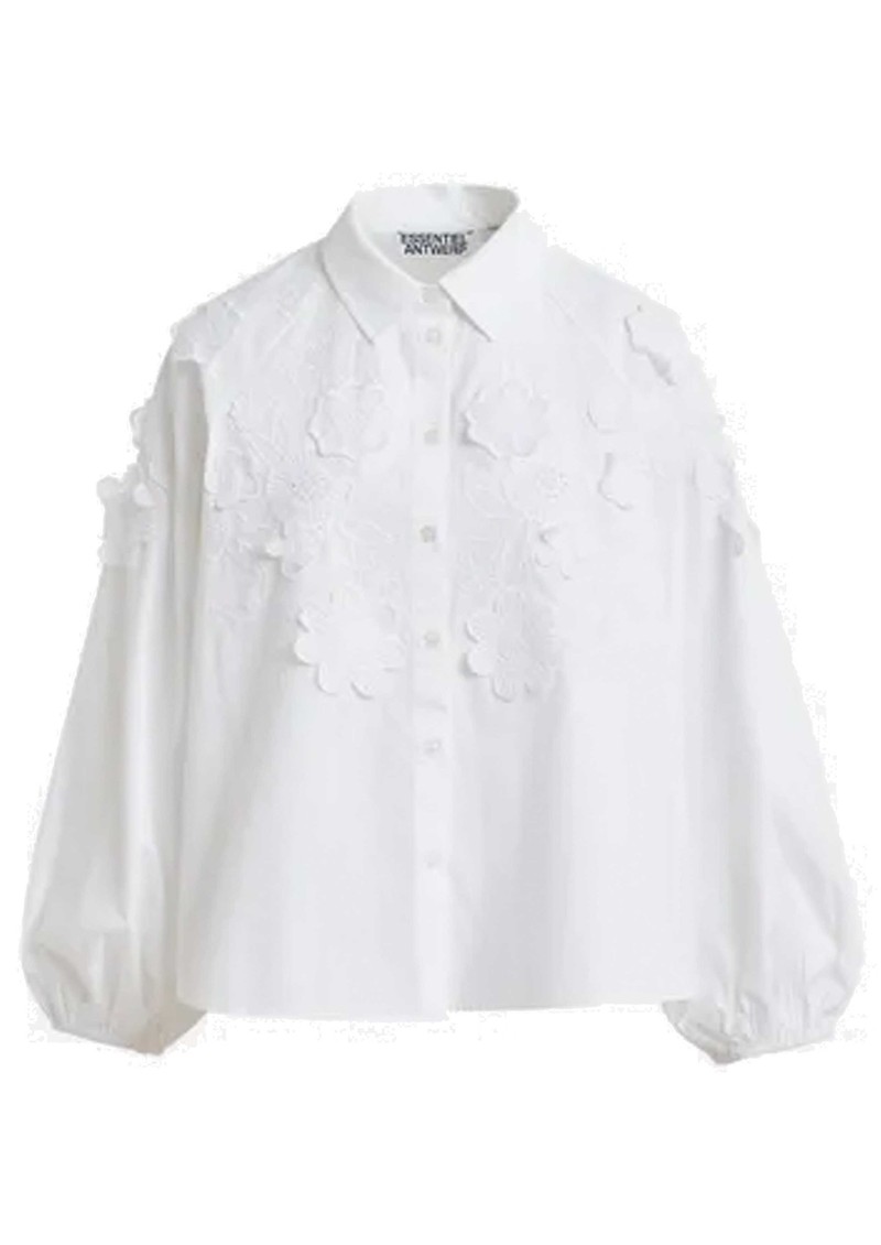 The Essentiel Antwerp Joella shirt in white is a fresh, statement cotton poplin style elevated with intricate floral appliqué embroidery. Designed with voluminous balloon sleeves and a relaxed oversized shape, it feels airy, modern, and full of personality.
