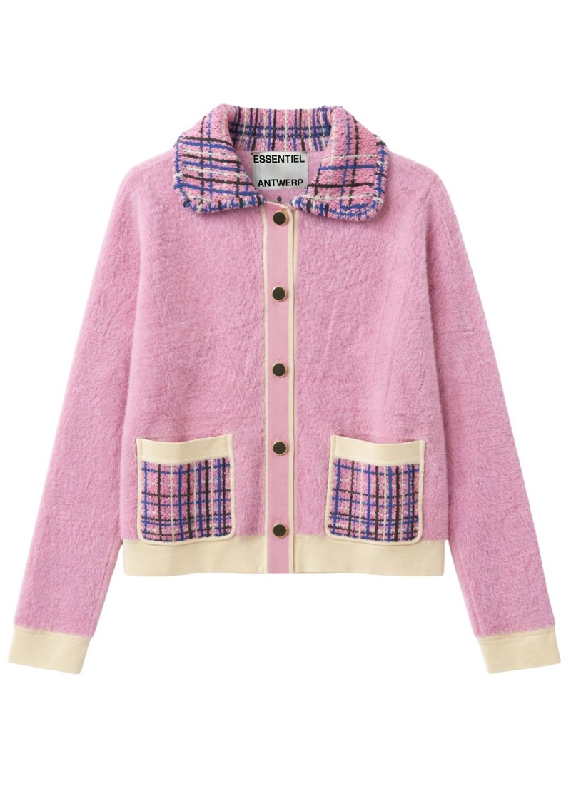 The Essentiel Antwerp Joilu Cardigan in Cotton Candy features a sweet pink hue with a tweed collar and patch pockets, and contrasting hems. This cardigan offers a relaxed fit and midweight spongy knit with a soft, fluffy texture. Key features includes: