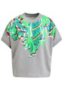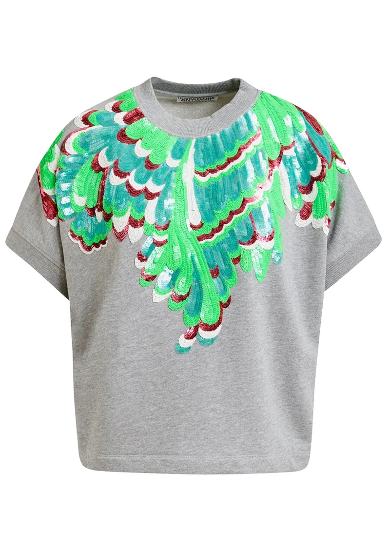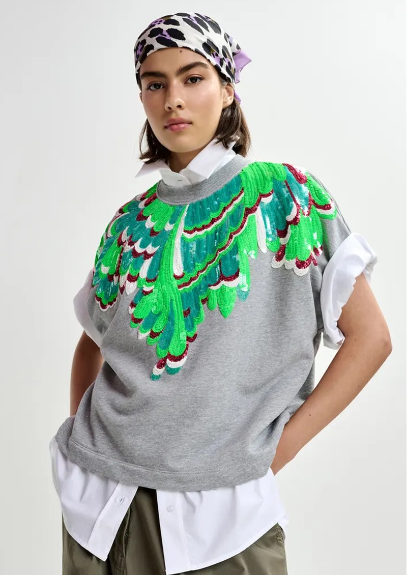 Add playful sparkle to your casual wardrobe with the Essentiel Antwerp Jolies Short-Sleeve Sequin Sweatshirt in Foggy Brain - a grey cotton sweatshirt featuring green feather sequin embellishments, a crew neckline, short sleeves, ribbed edges, and a relaxed, regular fit.