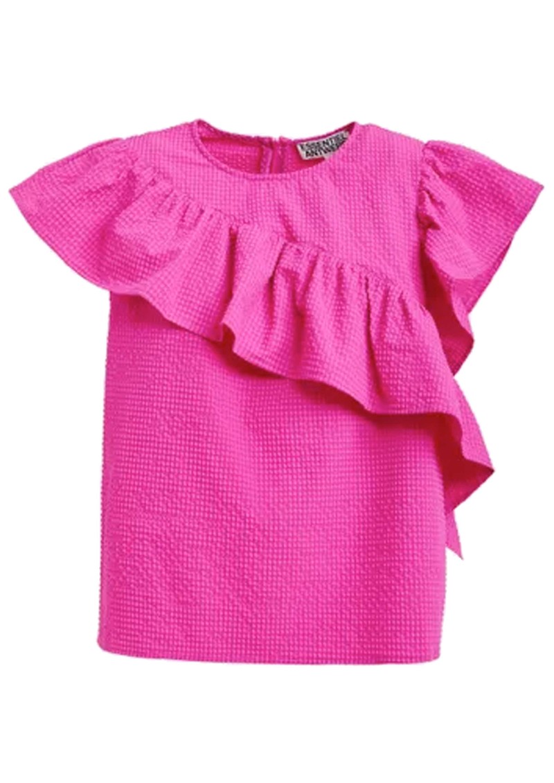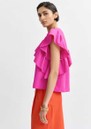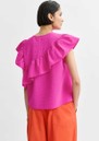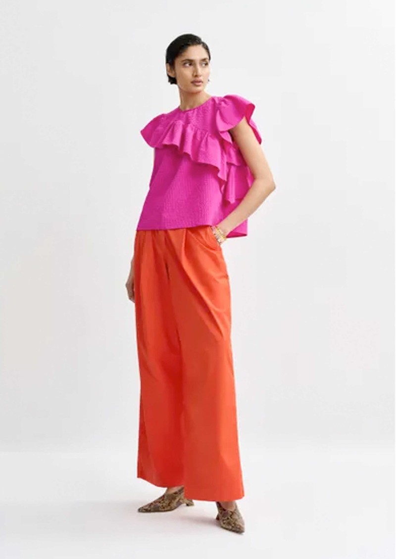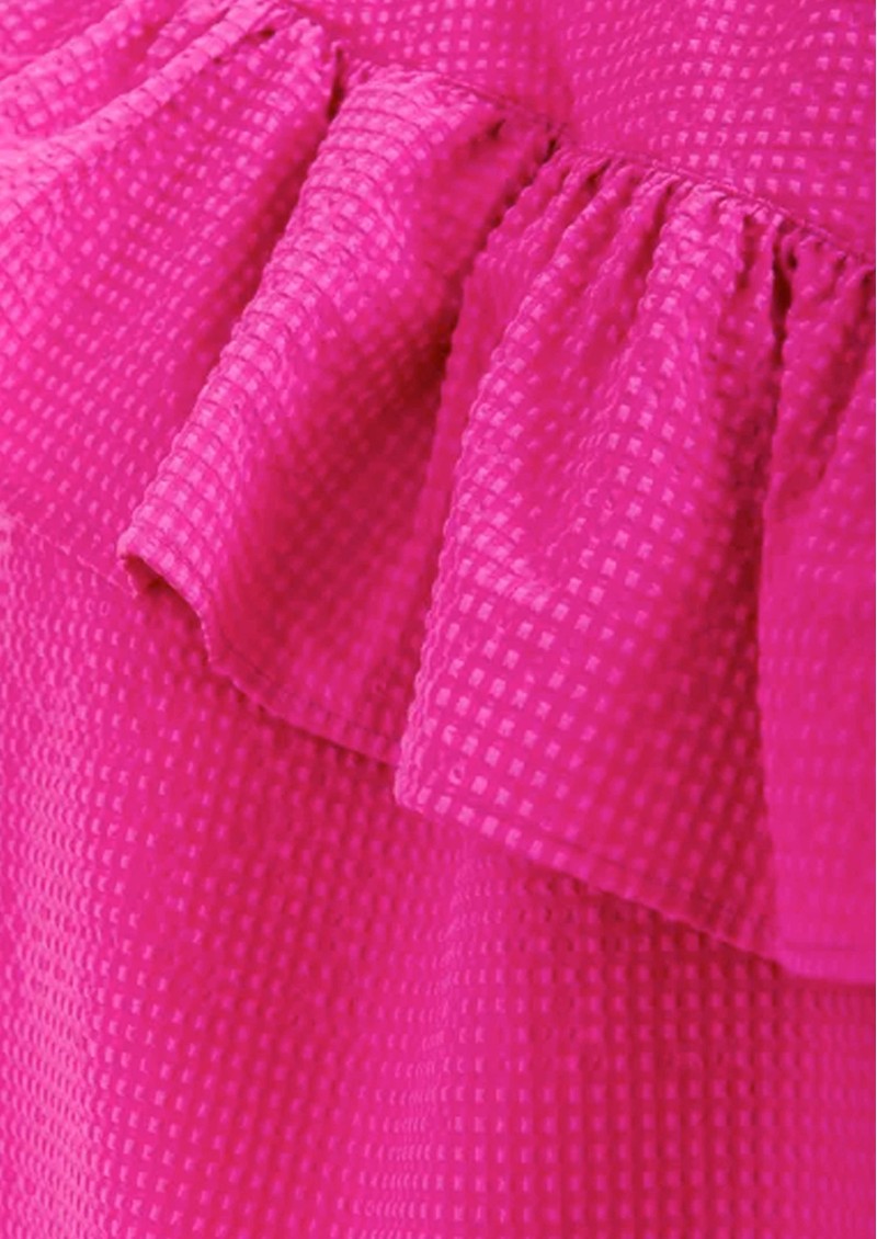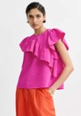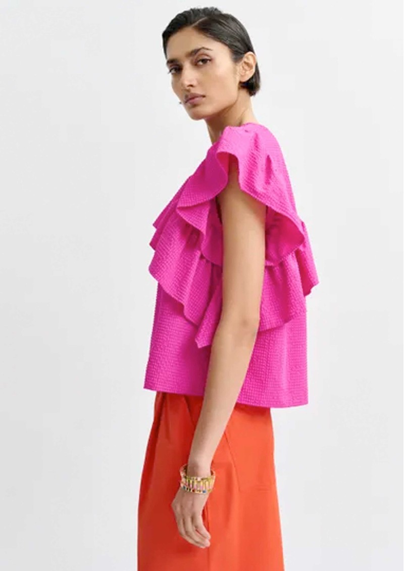 Add a playful touch to your wardrobe with the Essentiel Antwerp Joojoo Top in Mauve - a bright pink asymmetrical top crafted from soft textured fabric, featuring a crew neckline, short ruffle sleeves, statement ruffle detailing, back neck zip closure, and a relaxed boxy fit.
