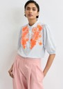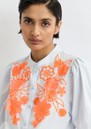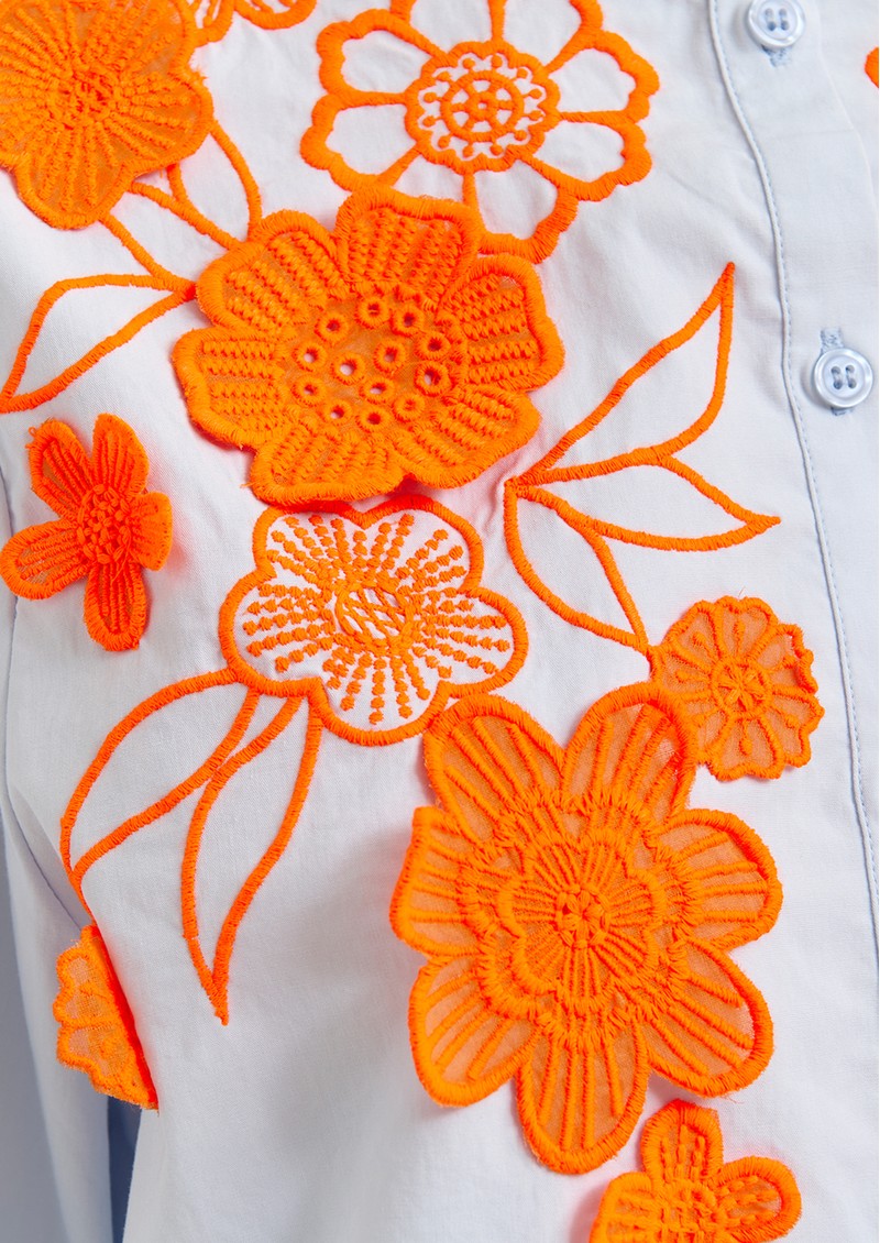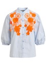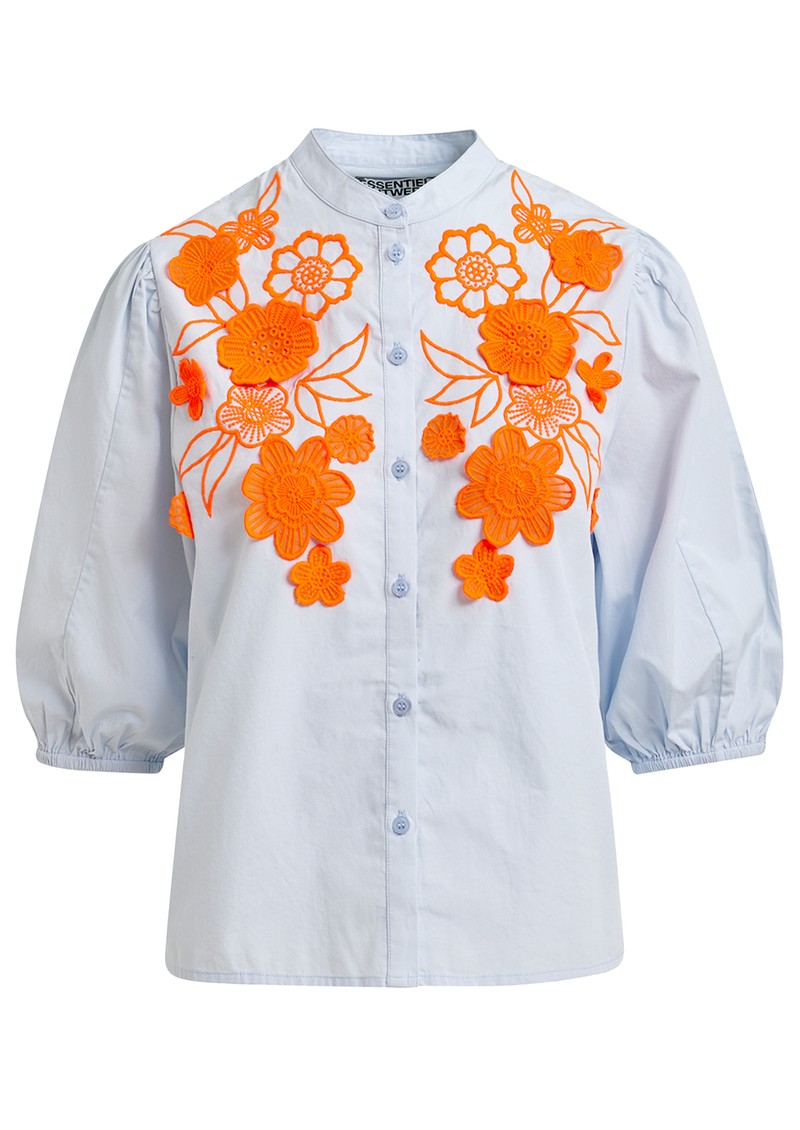 Say hello to the Essentiel Antwerp Jorja Shirt, designed in a crisp light blue cotton and finished with appliqué embroidered flowers in a neon orange. Other features include: