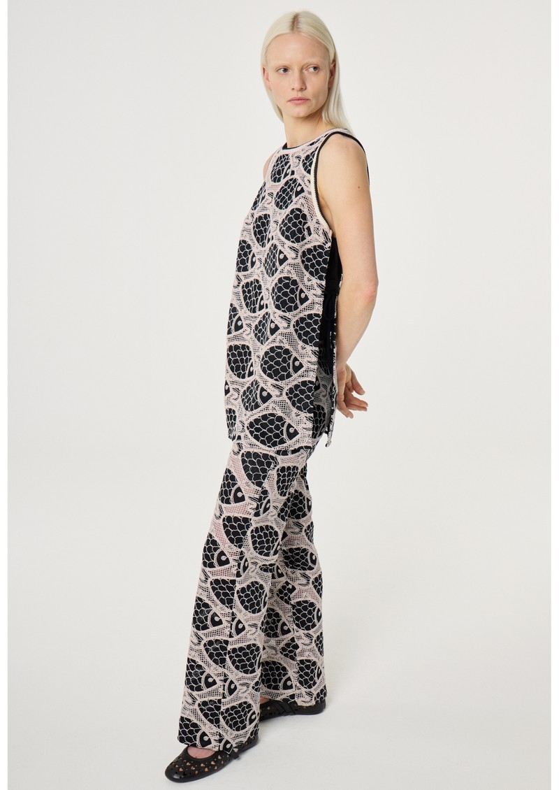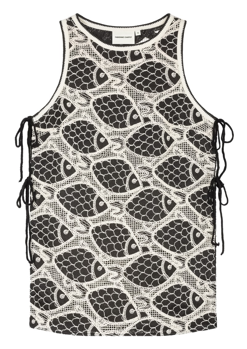 Introducing the Luca Top from Fabienne Chapot which is designed in a black mesh fabrication, beautifully embroidered with a white fish print. This sleeveless top is open at the sides with tie detailing and lined through the bodice for extra coverage. Other features include: