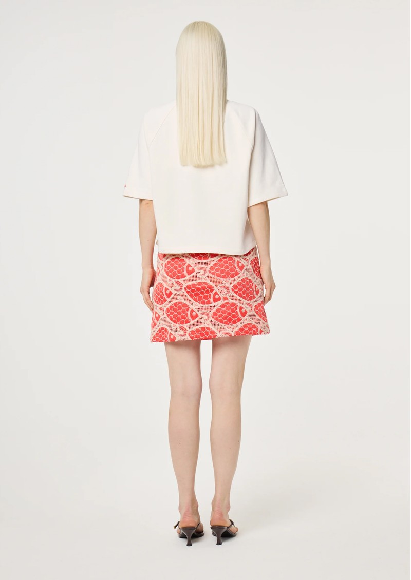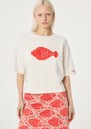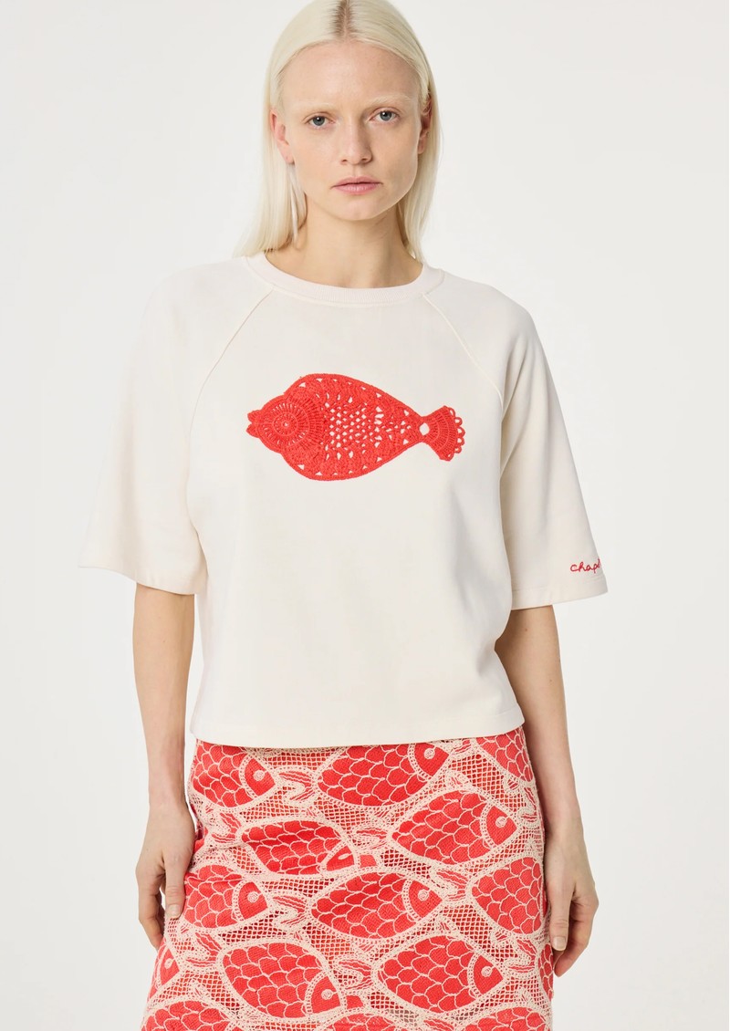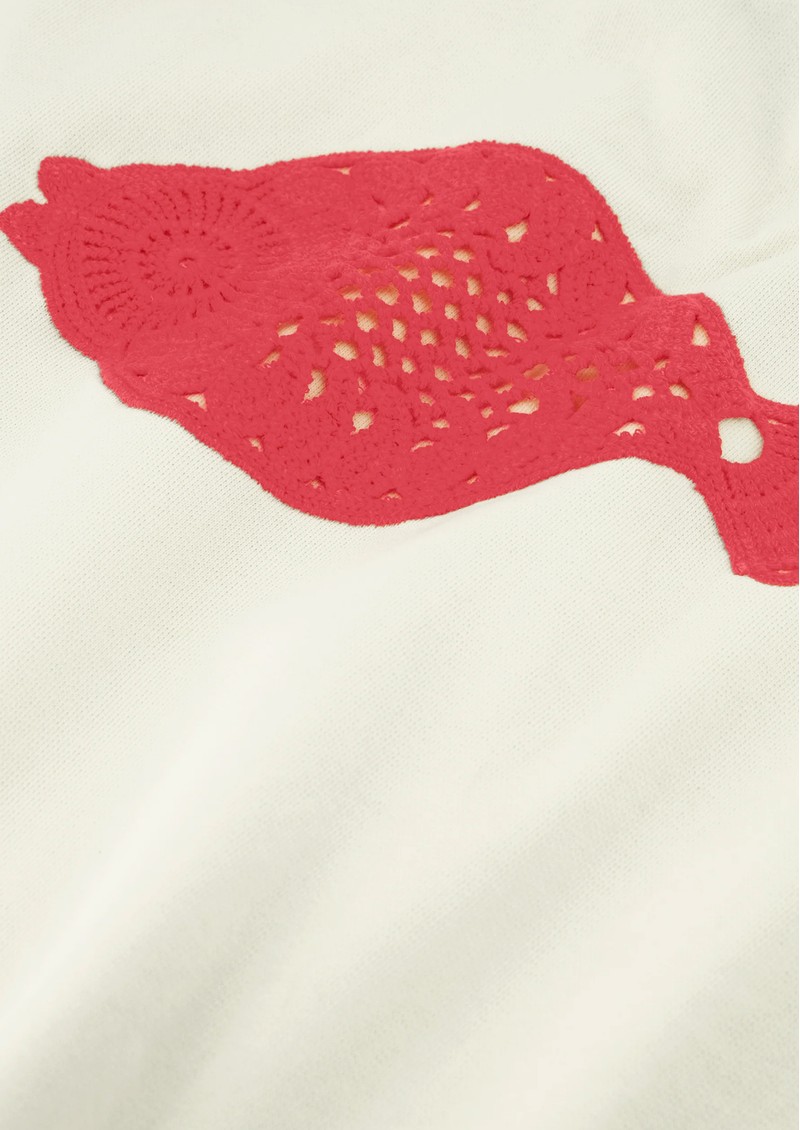 Introducing the Fabienne Chapot Nanda Sweater, designed in a white cotton fabrication. This sweater also features a vibrant red crochet fish applique on the front. This boxy shape, sits relaxed on the body and also features: