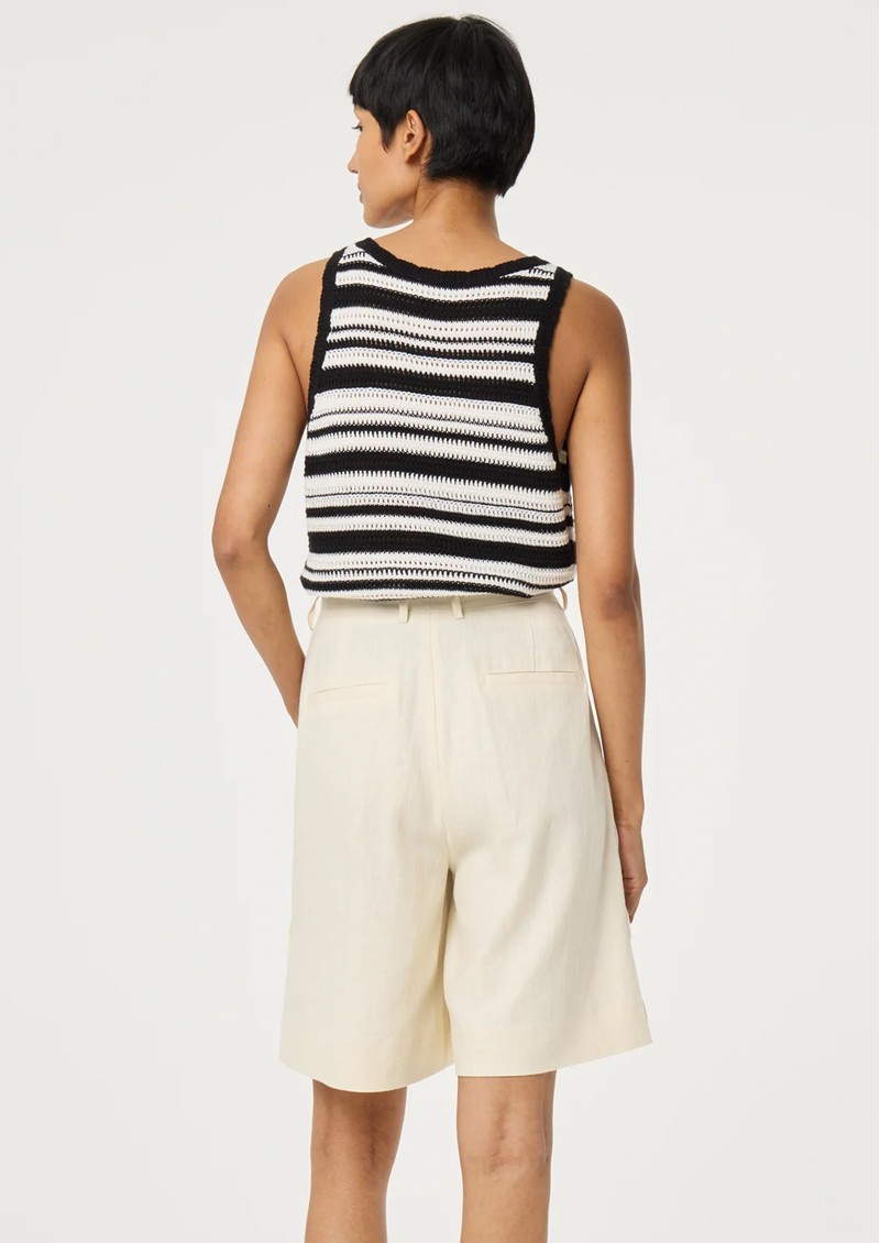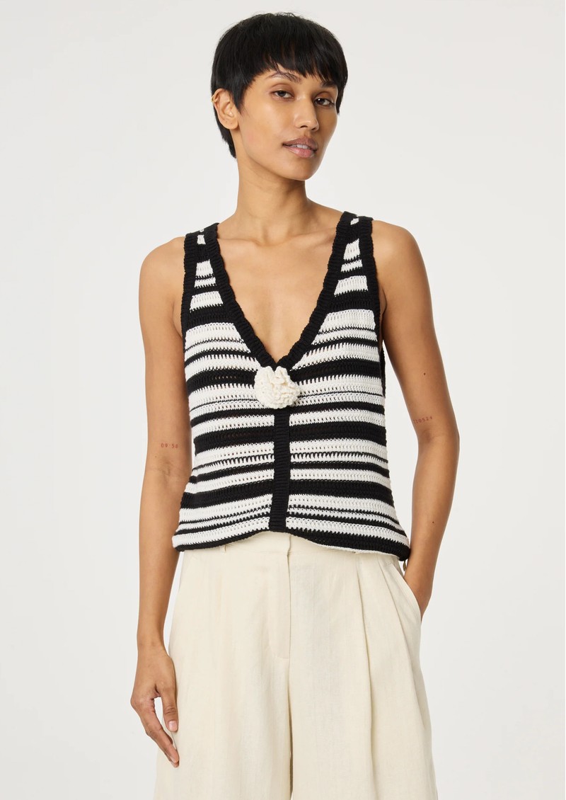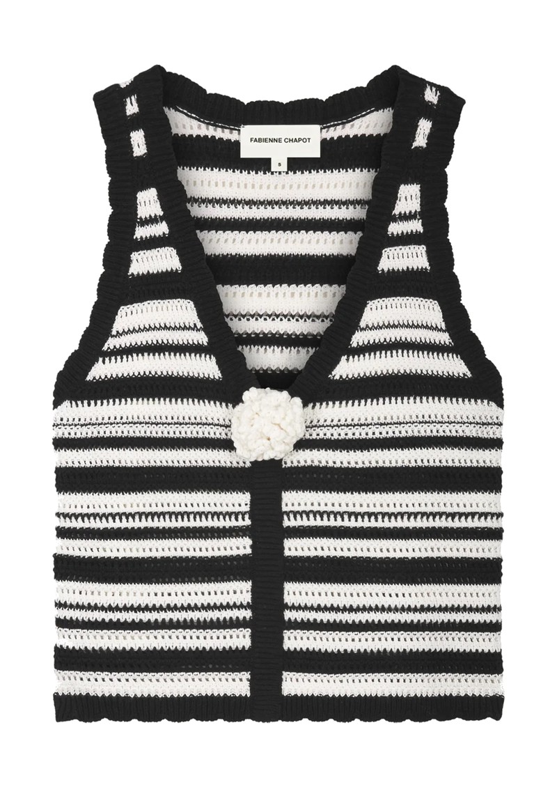 Introducing the Fabienne Chapot Paulina Crochet Top which features a black and white crochet design. This sleeveless top features a playful flower detail at the neckline. This slim fitted style is also slightly cropped in length. Other features include: