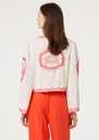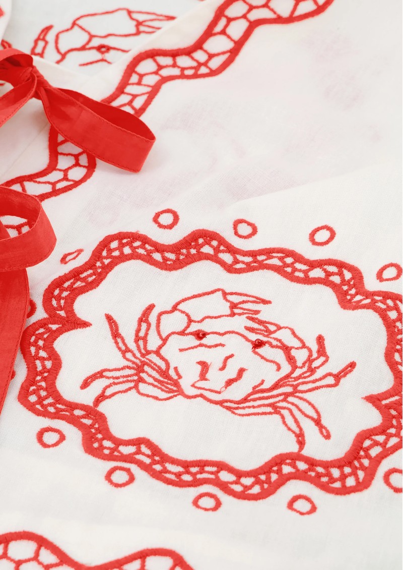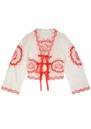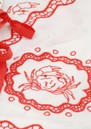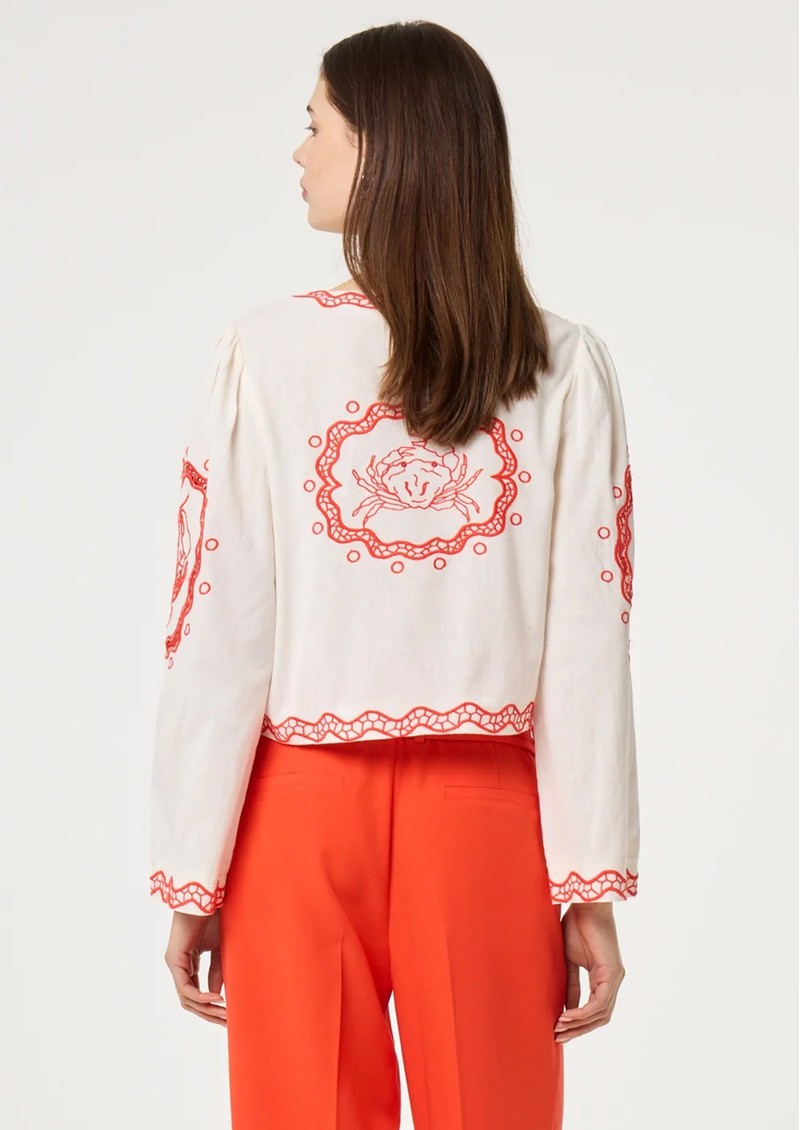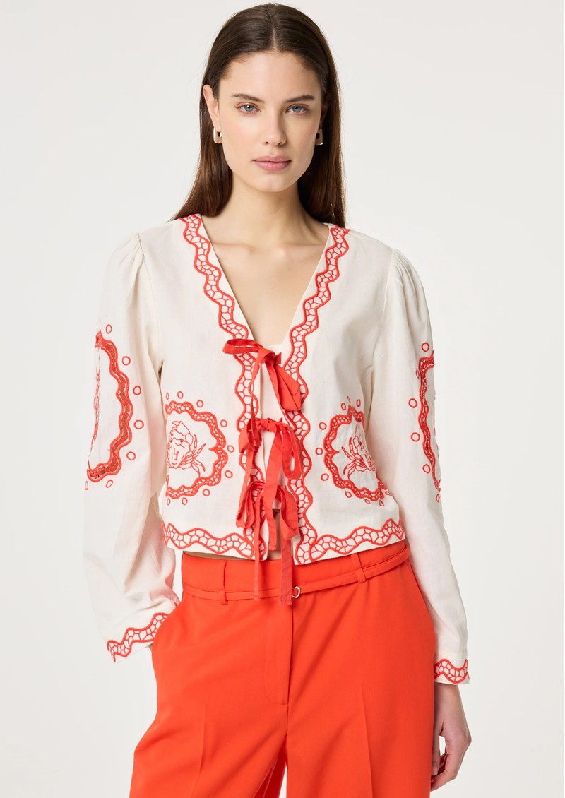Introducing the Serviette Blouse from Fabienne Chapot, beautifully decorated in an embroidered red design, against a classic white base. This blouse features a V shaped neckline, an open front with ribbon ties and a breathable cotton mix fabrication. Other features include: