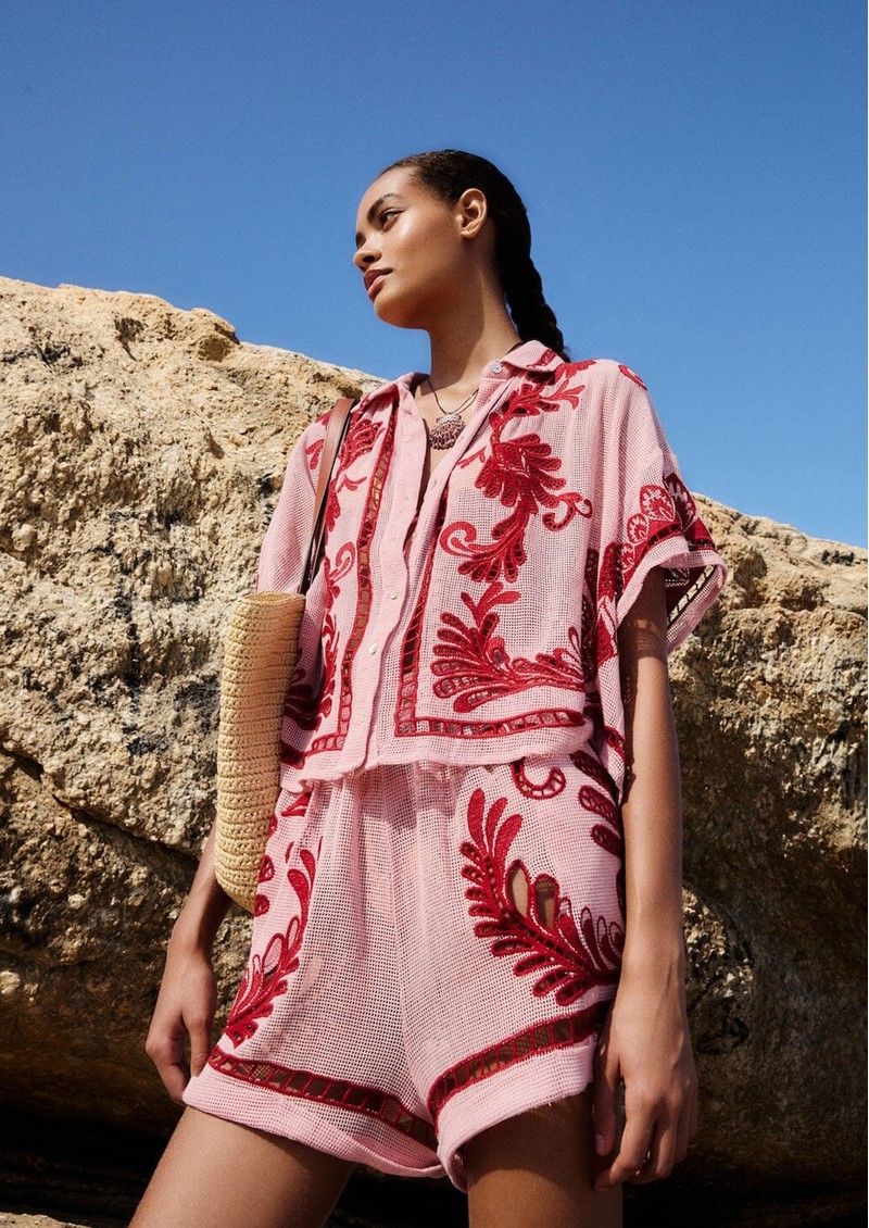 Capture effortless elegance with the Farm Rio Arabesc Shorts. Featuring a soft, flowing silhouette, these 100% cotton shorts feature open weave delicate arabesque patterns all over. These shorts offers the perfect blend of comfort, style, and vibrant Brazilian spirit.