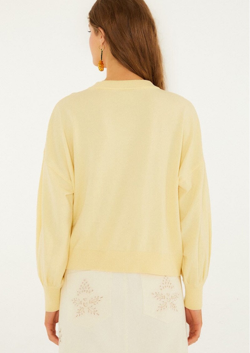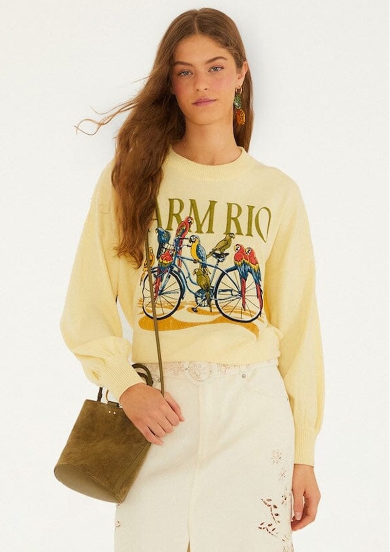 Embrace the playfulness of new brand, Farm Rio and this gorgeous Birds Bicycle Embroidered Sweater in a sunny yellow hue. Featuring a fun birds bicycle graphic which has been embroidered on the front. Other features include: