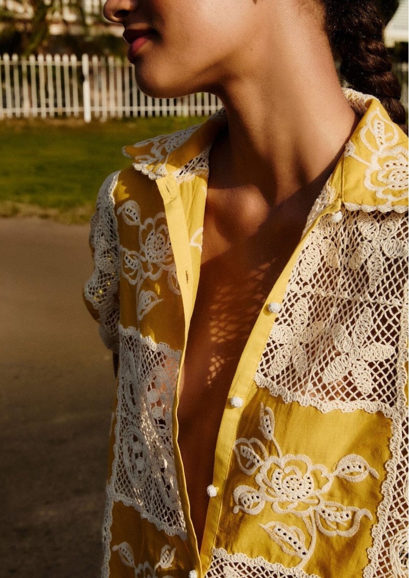 Capture effortless, tropical elegance with the Farm Rio Lace Short Sleeve Shirt. Delicate lace merges with playful patterns in vibrant yellow hues. The classic collar adds structure to the romantic, flowing silhouette. This shirt is perfect for sunny afternoons or evening outings. Key features include: