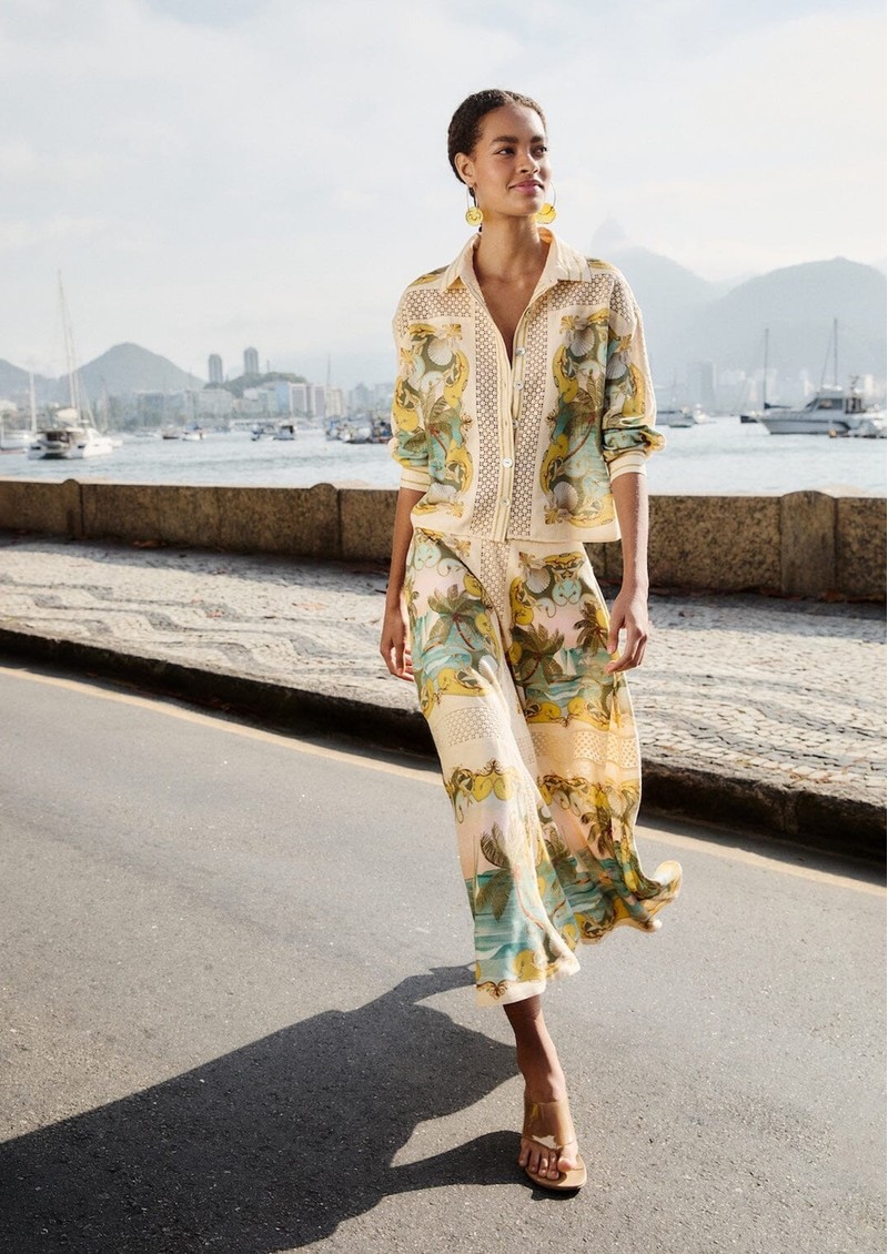 We'll be styling this Farm Rio Sand Royal Sea Crochet Midi Skirt with the matching shirt for a cool co-ord look. Finish off by adding a Dragon Diffusion bag, and layers of golden Anna Beck jewels.