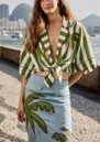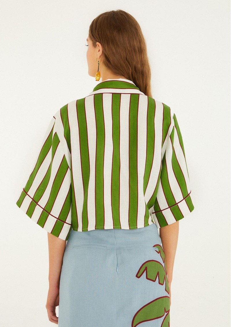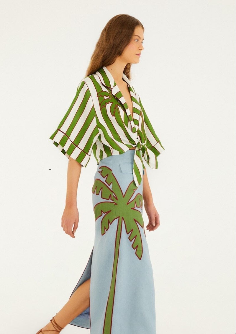 Introducing the Farm Rio Spring Stripes Linen Shirt, beautifully decorated in a striking green and white stripe. Feautring a palm tree motif, embroidered detailing and a feminine tie front, this is a Summer staple you just have to have. Made from a breathable linen fabrication, this top also features: