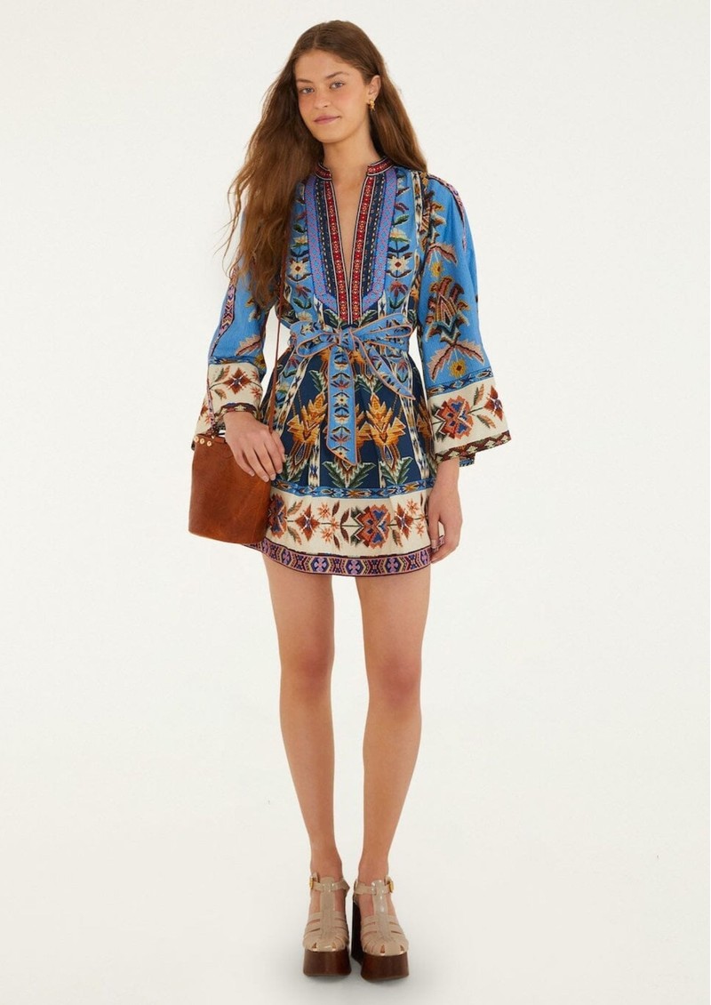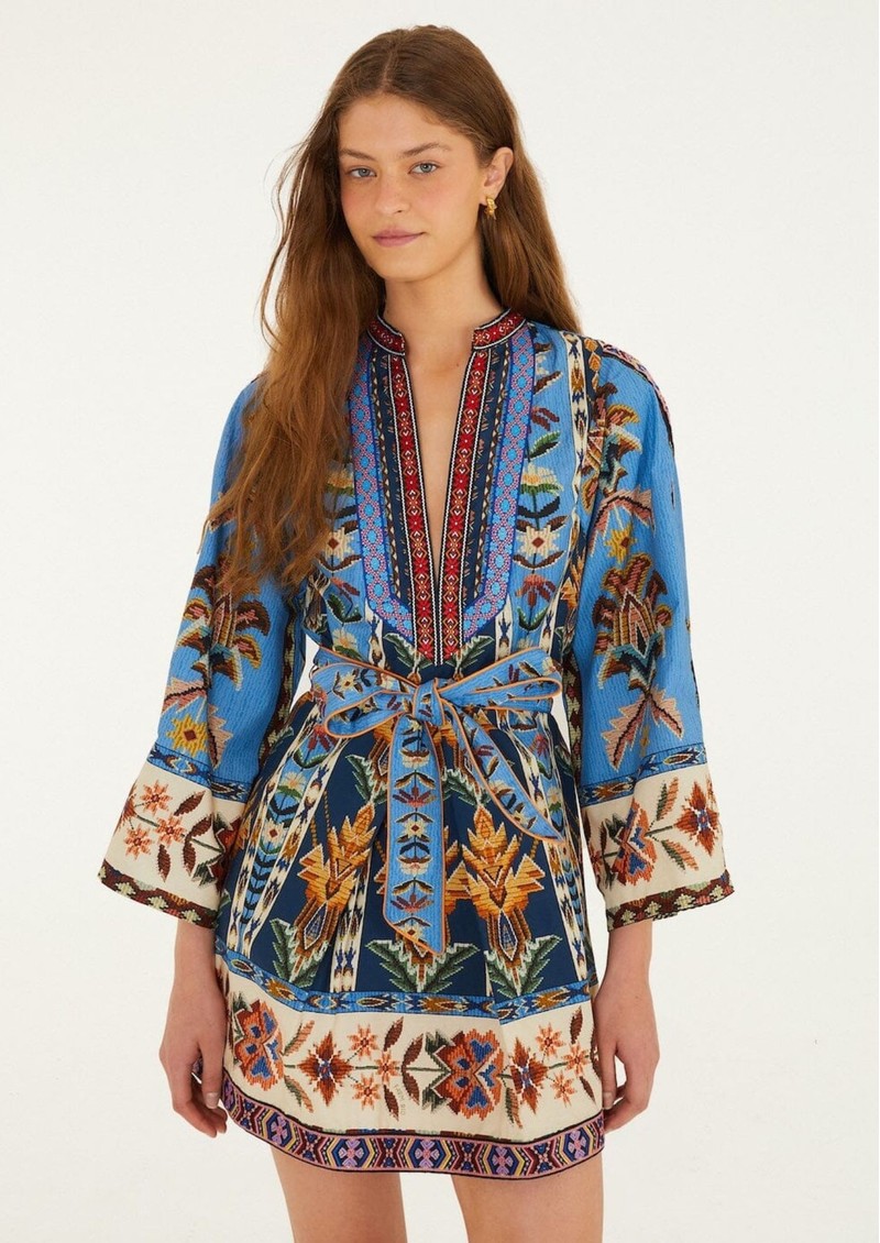 FARM RIO Tapestry Organic Cotton Mini Dress - Embroidered Blue