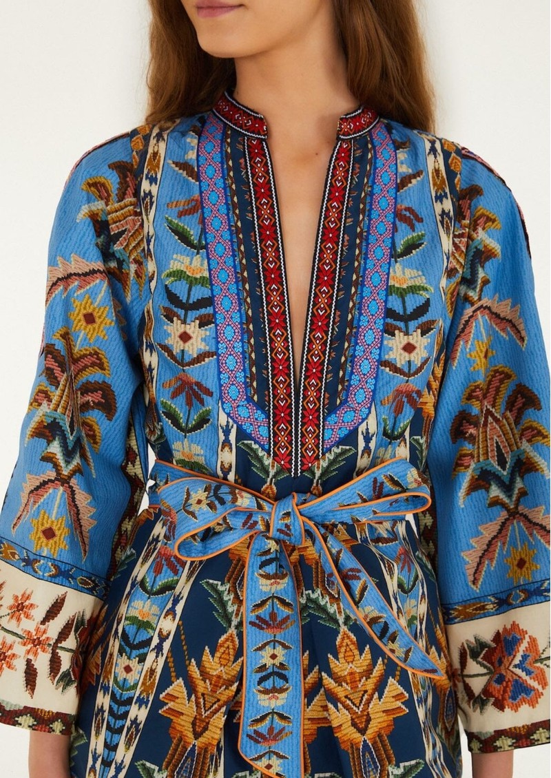 Introducing Farm Rio to The Dressing Room! Embody effortless elegance in this Farm Rio Blue Embroidered Tapestry Mini Dress. This style features a softly structured silhouette that drapes beautifully from a flattering V-neckline. Delicate blue embroidery creates an intricate tapestry of texture and detail, bringing an artisanal feel to the design.
