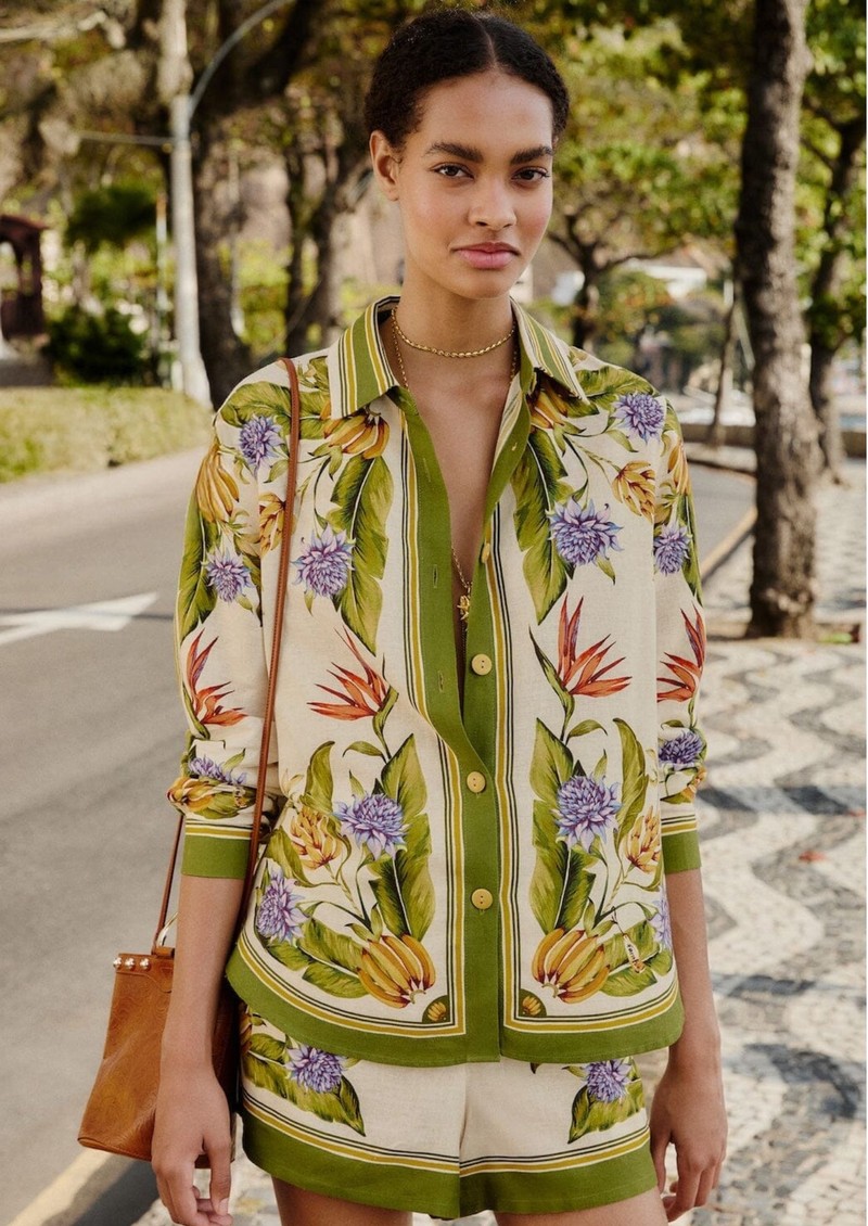 The Farm Rio Tropical Scarf Shirt is perfect for styling at home or away. Crafted from sustainable Euroflax and Lenzing fibers, this top boasts a crisp collar and a breezy silhouette that moves gracefully. Its warm sandy tones and playful scarf-inspired pattern infuse your wardrobe with a hint of Brazilian sunshine. Soft, breathable, and thoughtfully crafted, it brings effortless comfort and cheerful energy to any day.