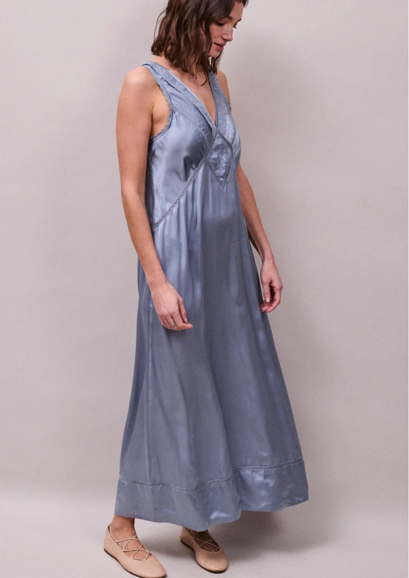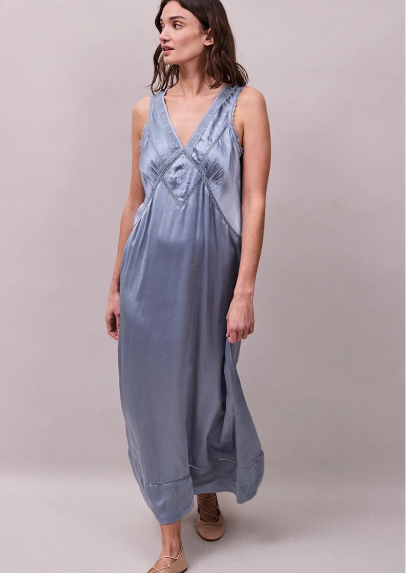 Slip into understated luxury with the Faune Primrose satin dress in cornflower blue, a signature silhouette that skims the body with a soft, fluid drape. Finished with delicate lace and a vintage-inspired embroidered motif, it’s a timeless piece that feels just as effortless styled for day as it does for evening.