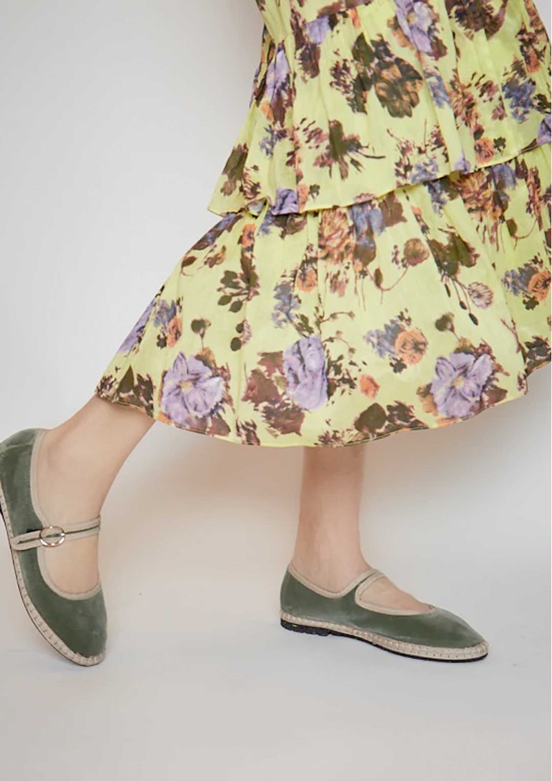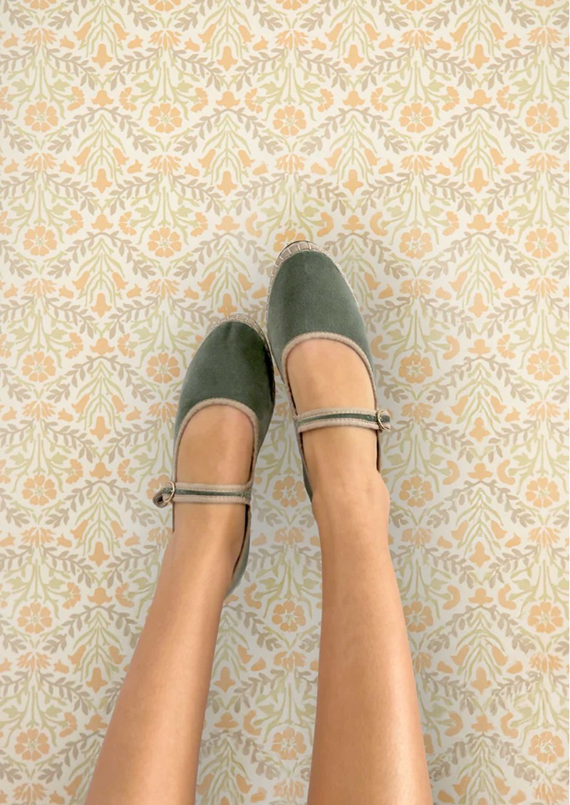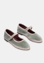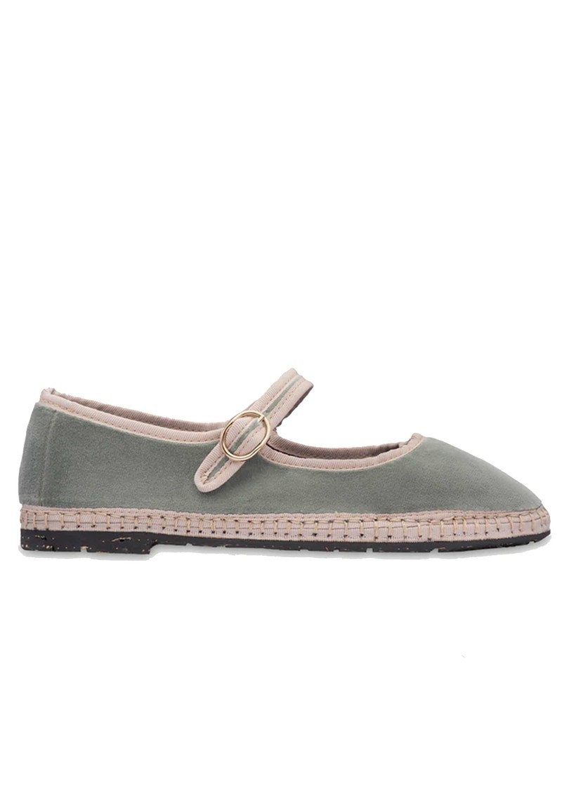 The Flabelus UTA Mary Jane flats in green and beige offer a fresh take on a classic shape, featuring a softly rounded pointed toe, a secure adjustable buckle, and elegant colour blocking for a modern touch. Handcrafted using traditional Spanish espadrille techniques with a flexible recycled rubber sole, they marry artisanal craftsmanship with effortless, all-day wear.
