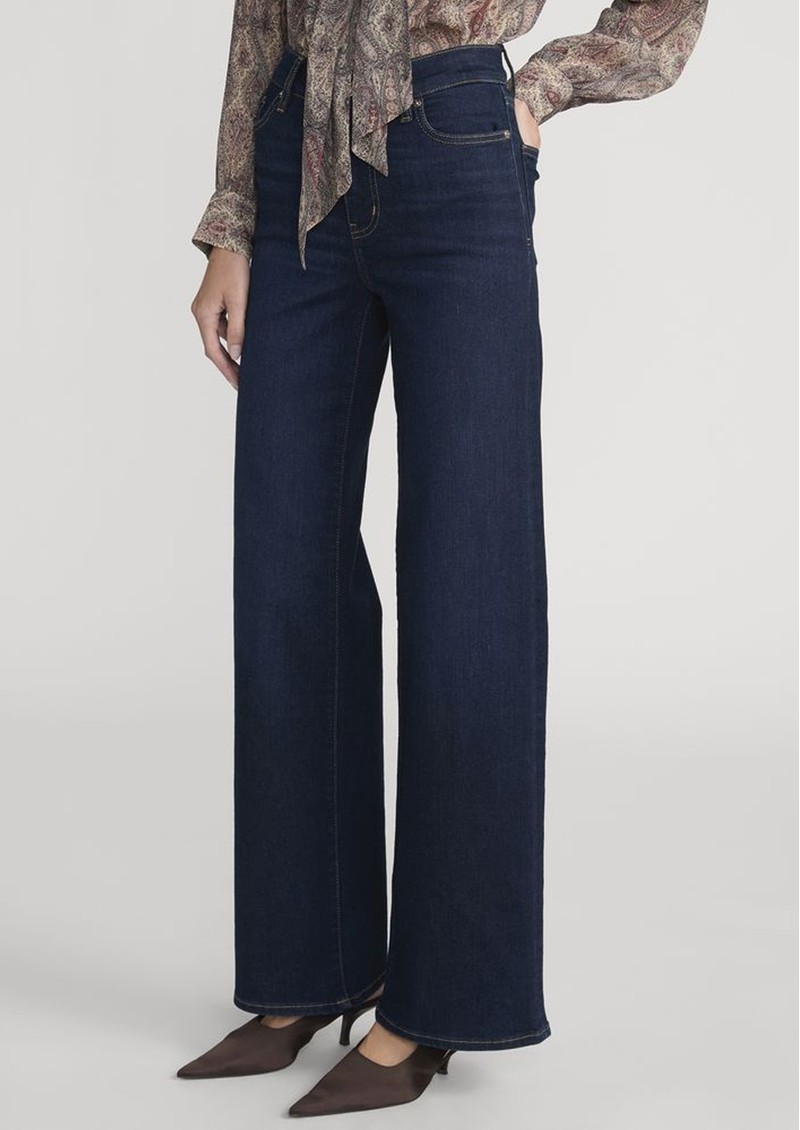 The Slim Palazzo High Rise Wide Jean is a firm favourite by beloved denim brand Frame. This flattering flared style is 70s inspired and comes in this gorgeous 'Fairway' deep indigo hue, complete with shiny black hardware. Other features of these Frame jeans include: