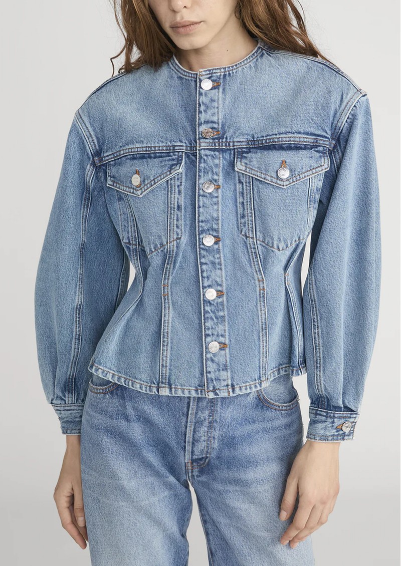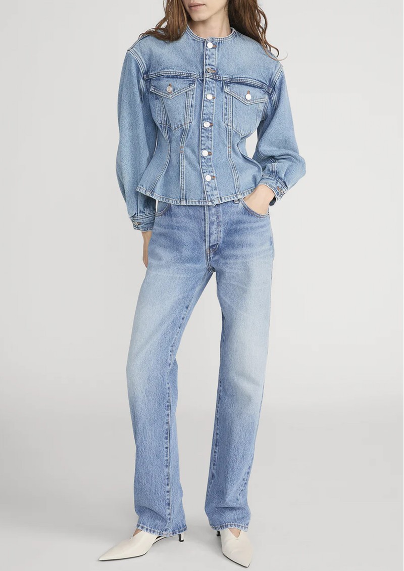 Introducing the new Frame Denim Nipped Collarless Jacket, designed in a gorgeous mid blue wash called 'Umbria'. This clean collarless design has a nipped in waist, creating a feminine peplum waistline for a unique design. Other features include: