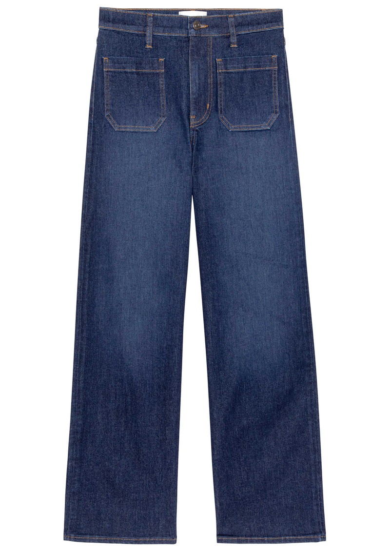 The Frame Anchor High Rise Wide Leg Jeans in Ciciero blue offer a clean, straight-wide leg silhouette with a modern edge, combining a flattering high-rise waist with structured denim for a timeless, everyday fit. Finished with classic patch pockets and belt loops, they’re a versatile staple designed to elevate your off-duty wardrobe.