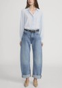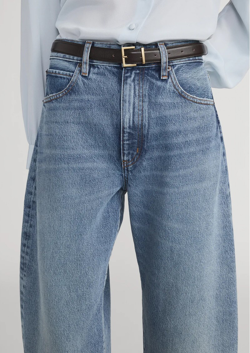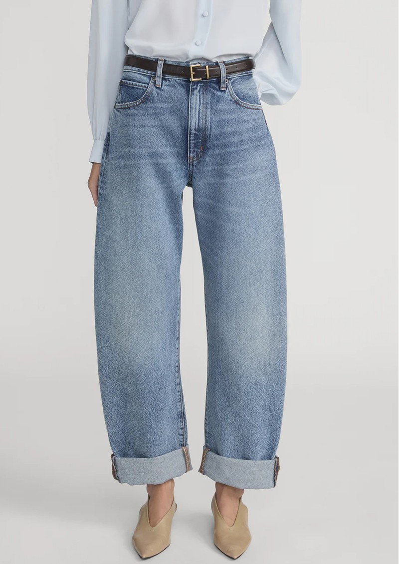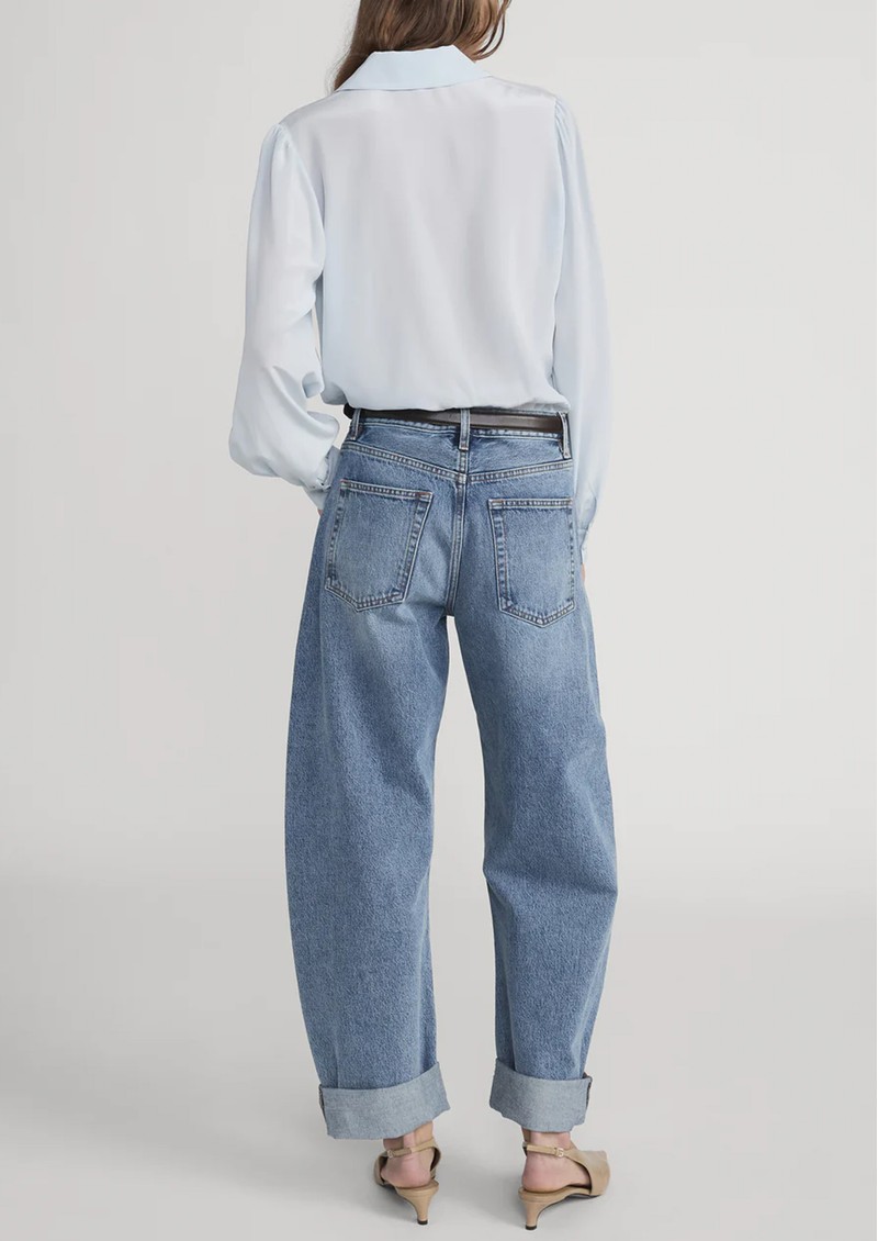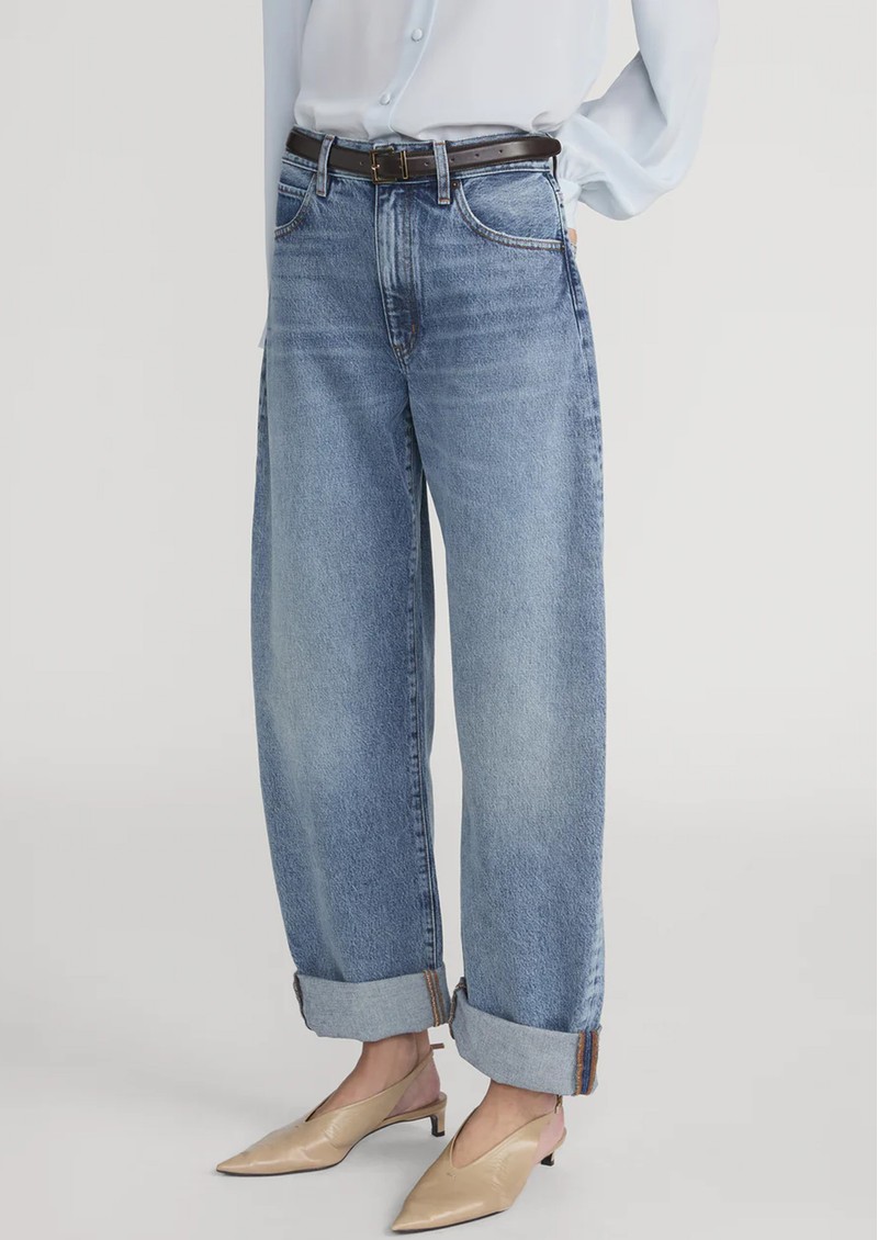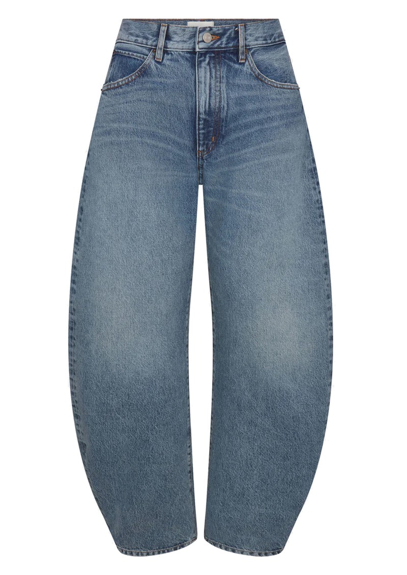 Introducing The Bubble Barrel Leg Jeans from Frame Denim, designed in new wash 'Tundra', a versatile blue wash. This style features the trending barrel silhouette with a curved outseam and a flattering high rise. Other features include: