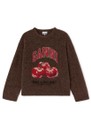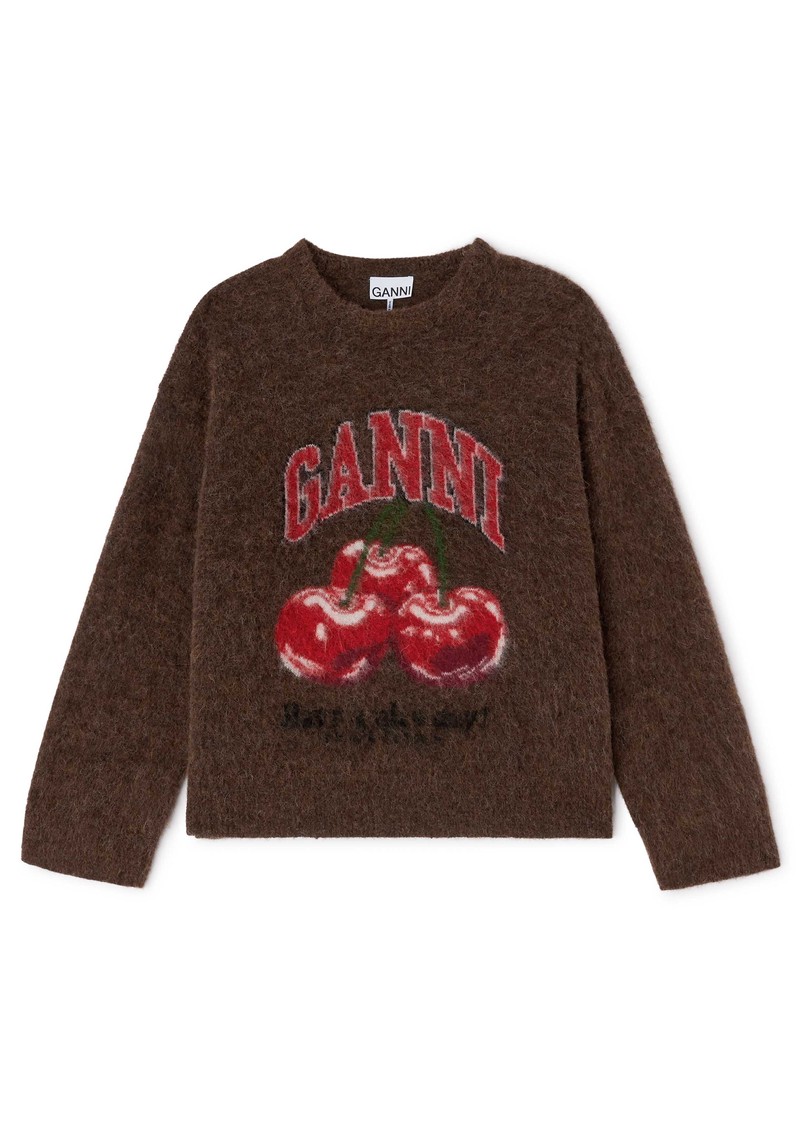 The Ganni Alpaca Graphic Sweater in Chicory Coffee is crafted from a soft alpaca-blend fabric for a cosy, luxe feel. Featuring a round neckline, full-length sleeves, and a playful central Ganni logo with cherries graphic, it’s a stylish statement piece for relaxed, chic dressing.