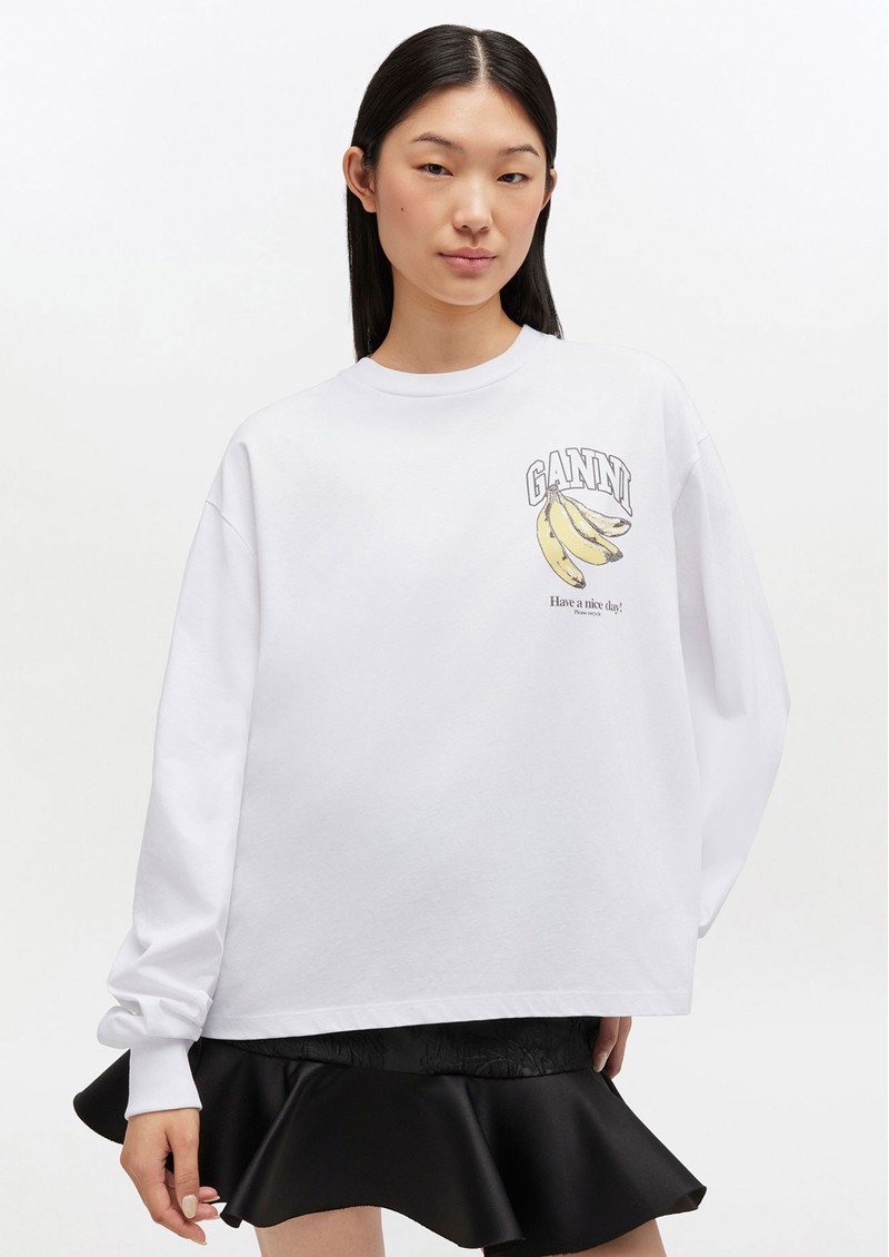 Adorable and eco-conscious, the Ganni Banana Printed Long Sleeve Jersey T-Shirt features a round neckline, long sleeves and a playful banana print graphic. Made from 100% organic cotton, it combines comfort, style, and sustainability. Key features of this Ganni top are: