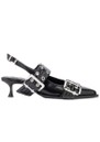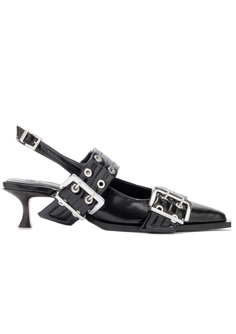 Step into sustainable style with the Ganni Buckle Kitten Heel in black, crafted from Oleatex - a luxurious vegan leather made from olive by-products. Featuring a sleek pointed toe, sculpted kitten heel, statement buckle detail, and slim adjustable ankle strap, this design exudes modern elegance with an eco-conscious edge.