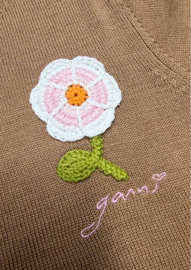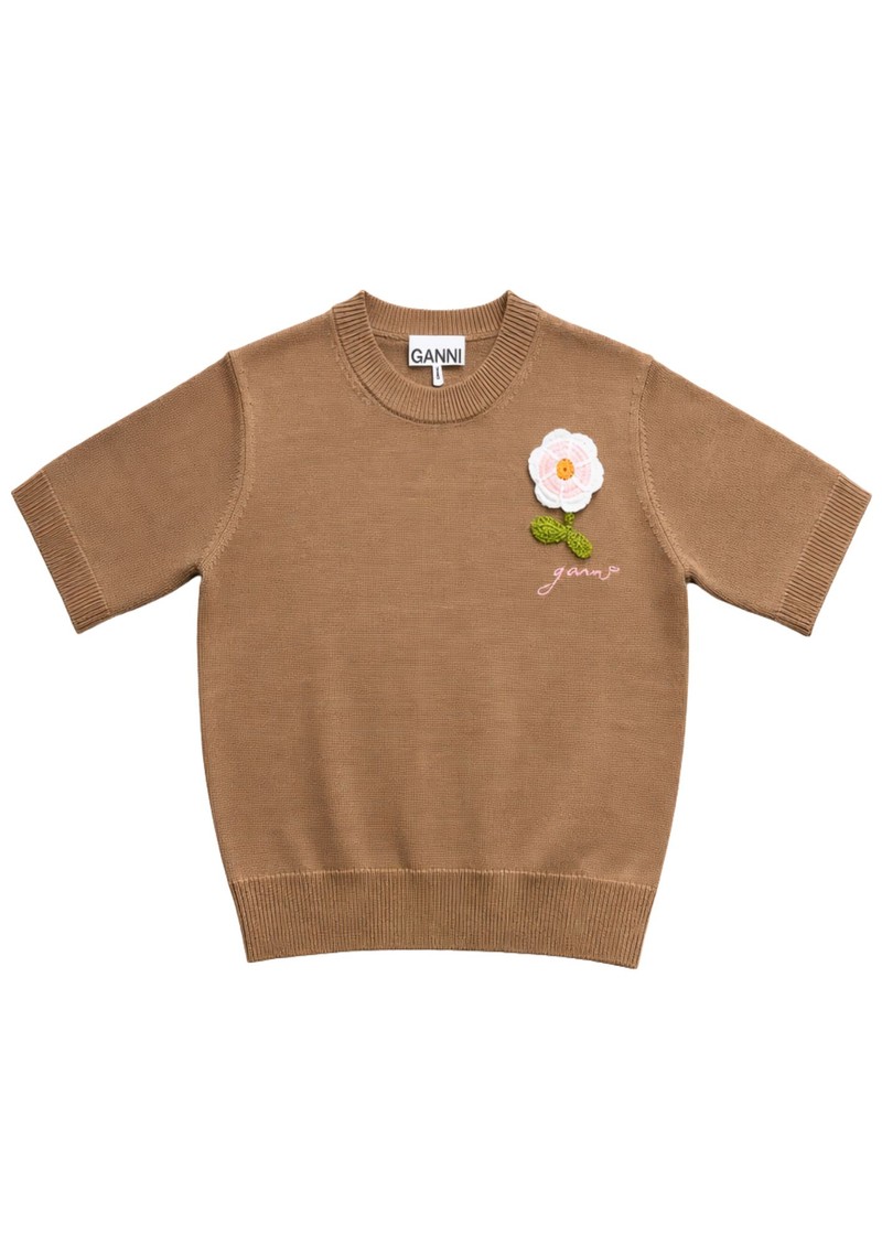 GANNI Crochet Applique Merino Wool Tee - Tobacco