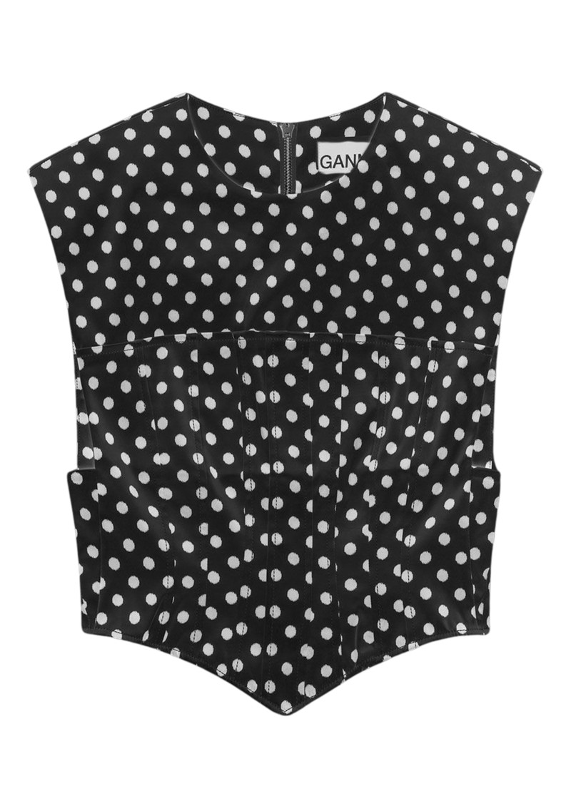 The Ganni Double Satin Corset Top in is a playful, eco-friendly piece which is sure to level up your new season wardrobe. Featuring a high round neckline, shoulder pads, and a corset style silhouette. It's all-over polka dot print adds a charming, feminine touch. Key features of this Ganni top are: