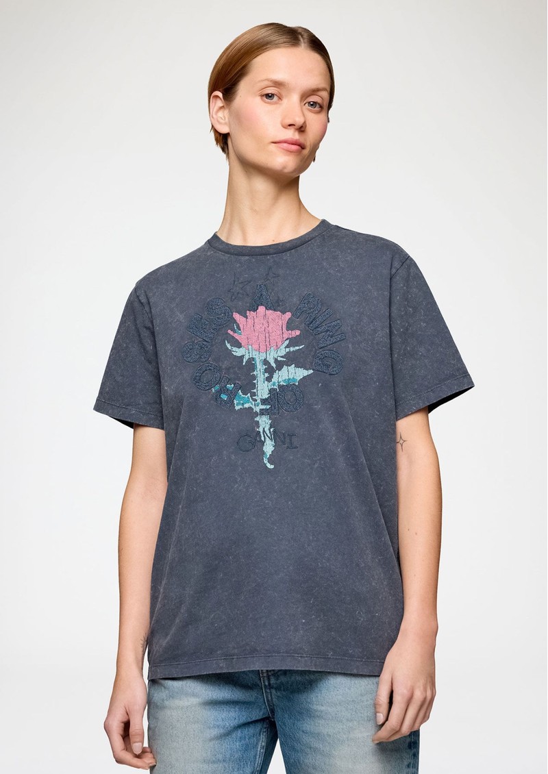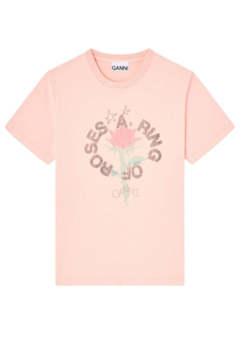 This Ganni Future Jersey Oversized T-Shirt t is designed with a classic round neckline and short sleeves, finished with a signature GANNI logo alongside a detailed “ring of roses” graphic, adding a distinctive decorative touch to this pretty pink tee. Key features of this Ganni t-shirt are: