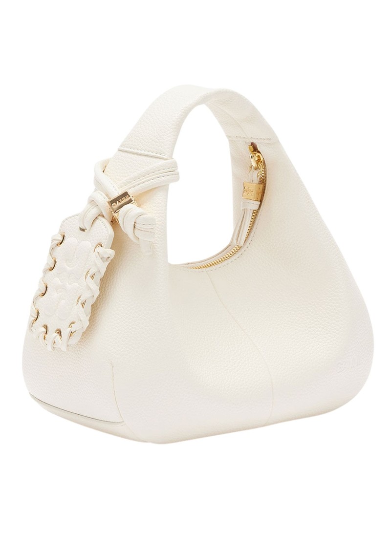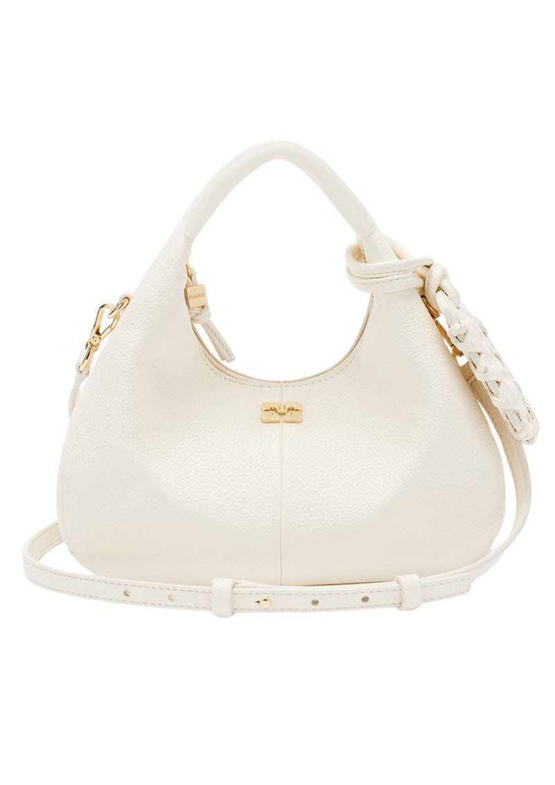 The Ganni Hobo Mini Grained Bag in Egret is a stylish, versatile accessory crafted from a sustainable blend of 52% recycled polyester and 48% polyurethane, with a grained texture and gold-tone detailing. Designed with a top handle, adjustable and removable shoulder strap, zipper closure, and internal pocket, it’s compact yet functional-perfect for carrying essentials like your phone, wallet, sunglasses, keys, and lipstick.