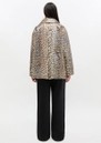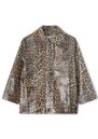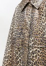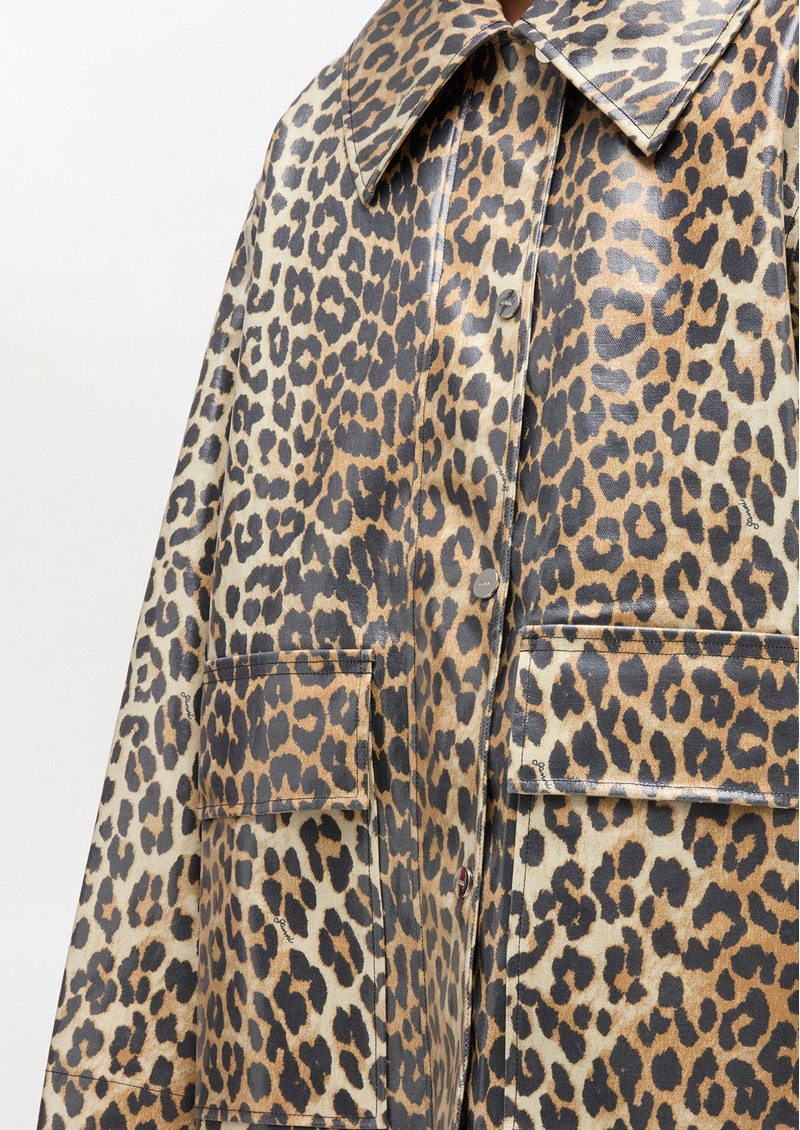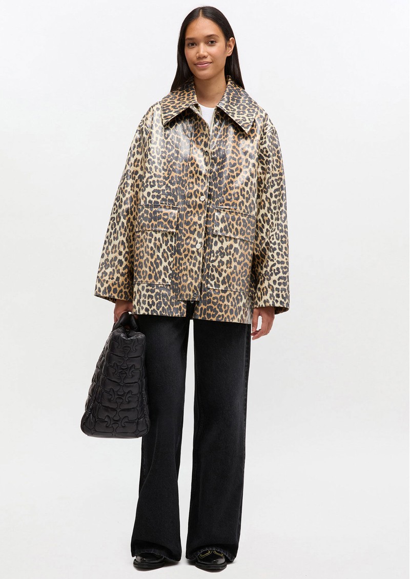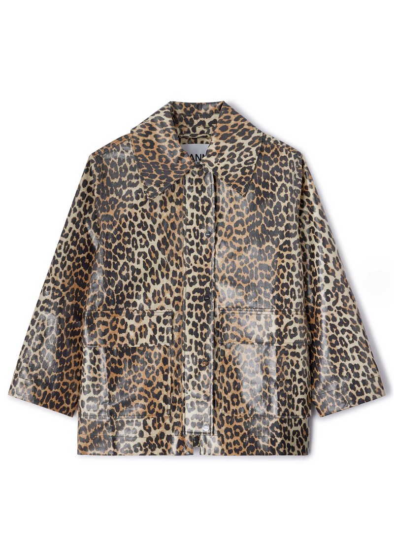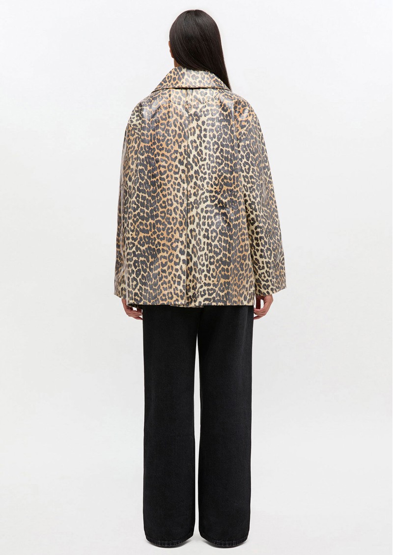 The Ganni Laminated Cotton Canvas Jacket in Almond Milk features a bold all-over animal print for a statement-making outer layer. With a classic pointed collar, boxy square shape, long sleeves, and front pocket detailing, it combines structure with playful style.