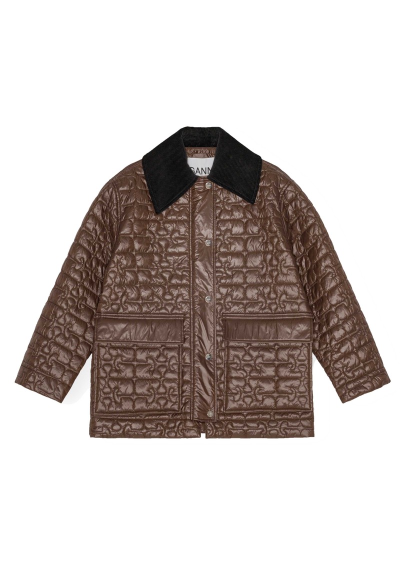 Meet the Ganni Shiny Quilted Midi Jacket in Chicory Coffee, featuring a contrasting black corduroy collar for a subtle twist. Filled with lightweight padding and crafted from 100% nylon, this jacket combines cosy warmth with effortless style, perfect for layering over your autumn and winter outfits.