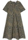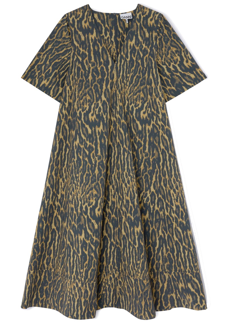 The Ganni Stretch Cotton A-Line Dress features a flattering V-neckline and an all-over animal print for a bold, stylish statement. Its classic A-line shape, short sleeves, and midaxi length make it a versatile piece for effortless, everyday elegance.
