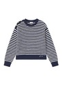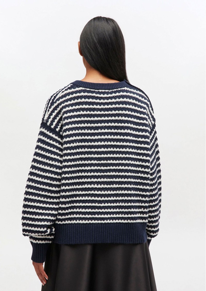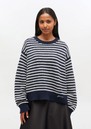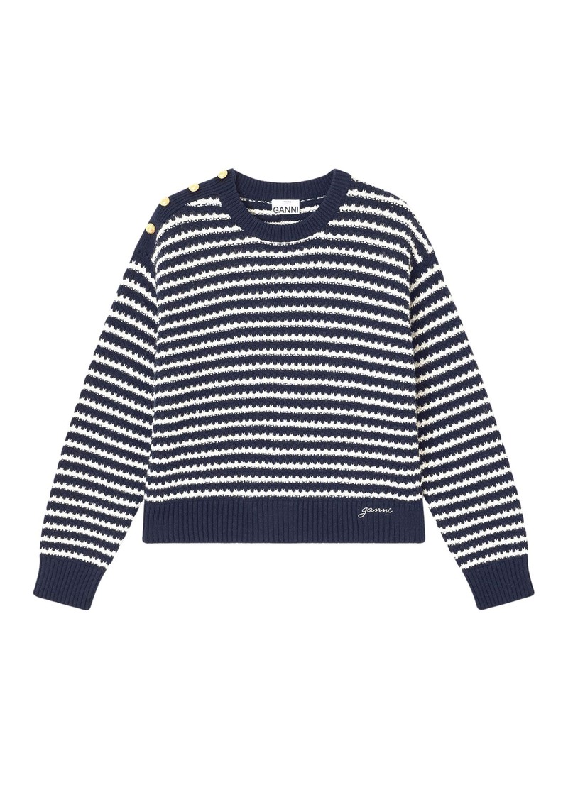 Introducing the Striped Wool Jumper in Sky Captain from Ganni. Crafted from soft wool and organic cotton mix this navy striped jumper is a wardrobe classic and the perfect way to tap into the stripe trend this season.