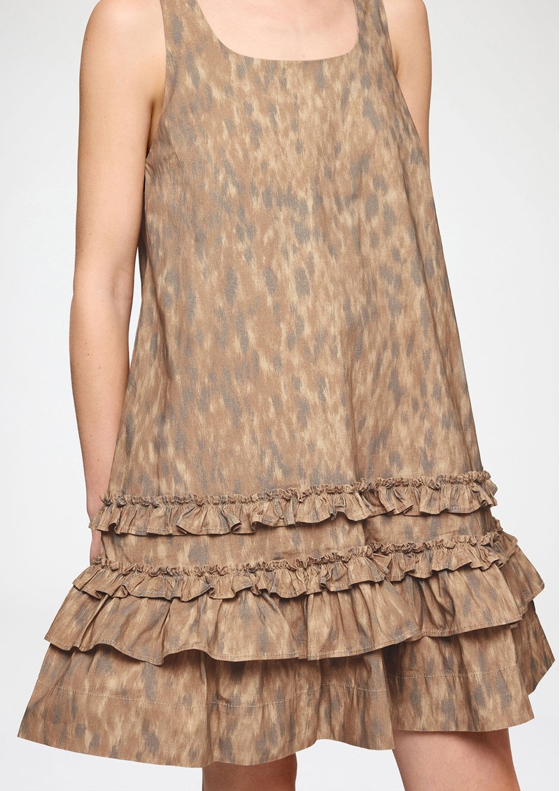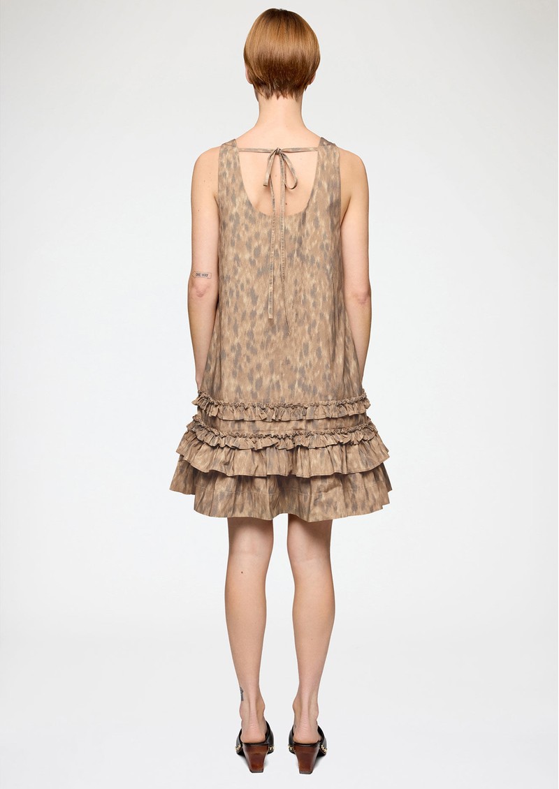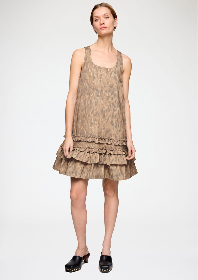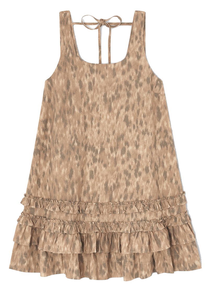 Say hello to the Ganni U-Neck Mini Dress, crafted from an organic cotton blend, this style features a bold blurred leopard print, U-neckline, and a flirty open back with an adjustable tie closure. Finished with a ruffled hem, it’s the perfect mix of fierce and feminine. Key features of this Ganni dress are: