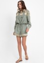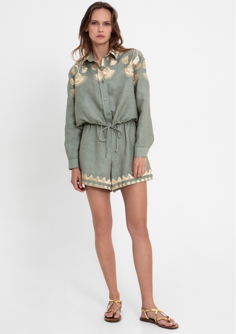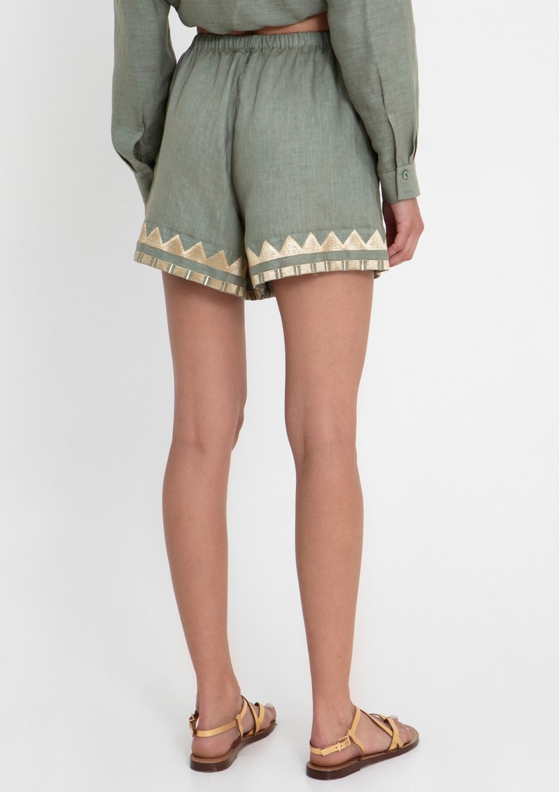 The Greek Archaic Kori Drawstring Linen Shorts in sage/gold are crafted from breathable linen for lightweight comfort. Featuring a drawstring tie closure, a relaxed fit, upper-thigh length, and gold-tone embroidery detailing at the hem, they offer an effortlessly stylish, easy-to-wear silhouette.
