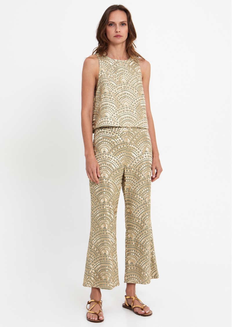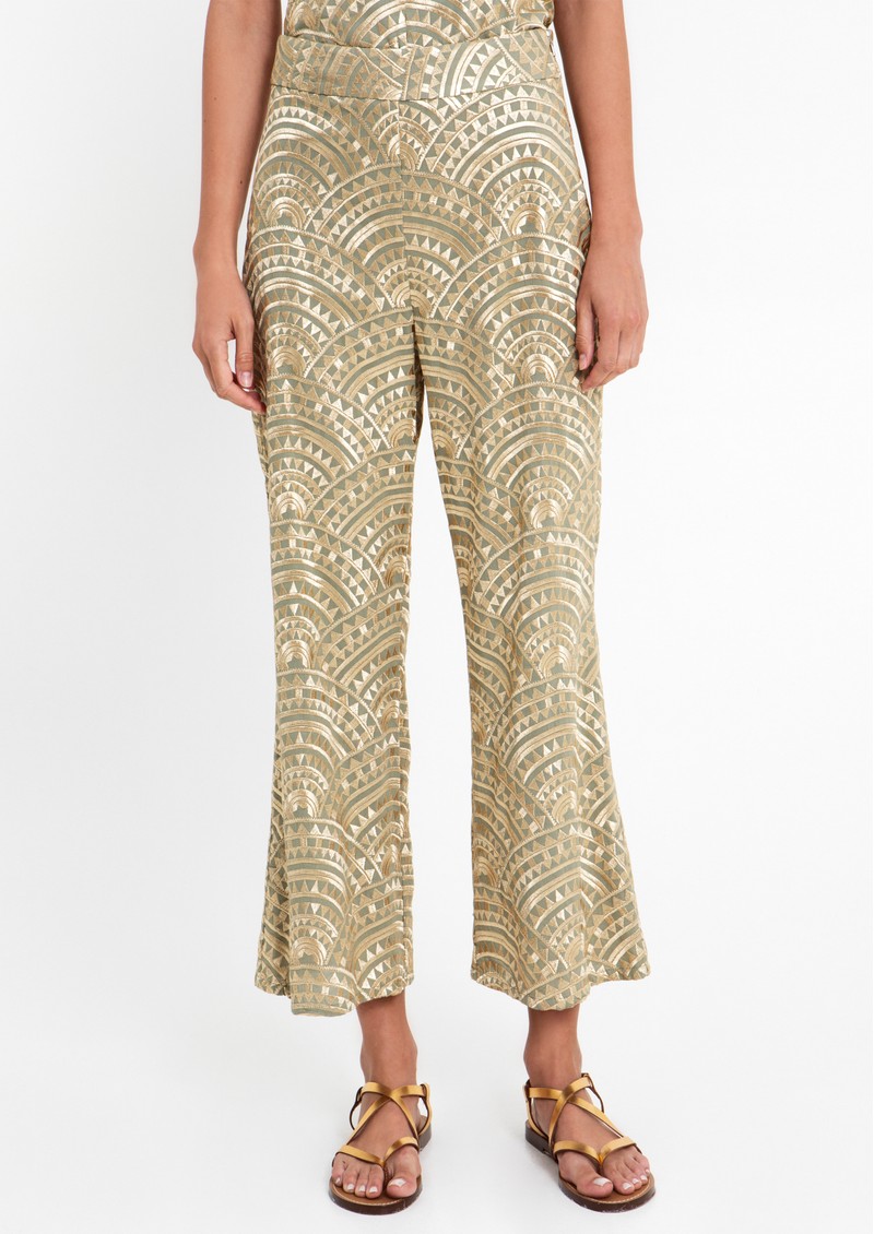 The Greek Archaic Kori Embroidered Cotton Cropped Trousers in sage/gold are crafted from cotton for comfortable, everyday wear. Featuring a tailored style with a defined waistband, signature gold fan embroidery all over a sage base, a slight kick-out at the hem, and a cropped length that hits the upper ankle, they offer a polished, stylish silhouette.
