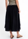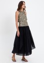 The Greek Archaic Kori Embroidered Midaxi Skirt in black/gold is crafted from flowing cotton (a soft, breathable natural fibre) for comfortable, effortless wear. Featuring a high-waisted design with intricate fan-style geometric embroidery on the wide waistband, this skirt falls to a flattering midaxi length.