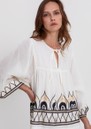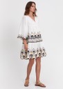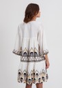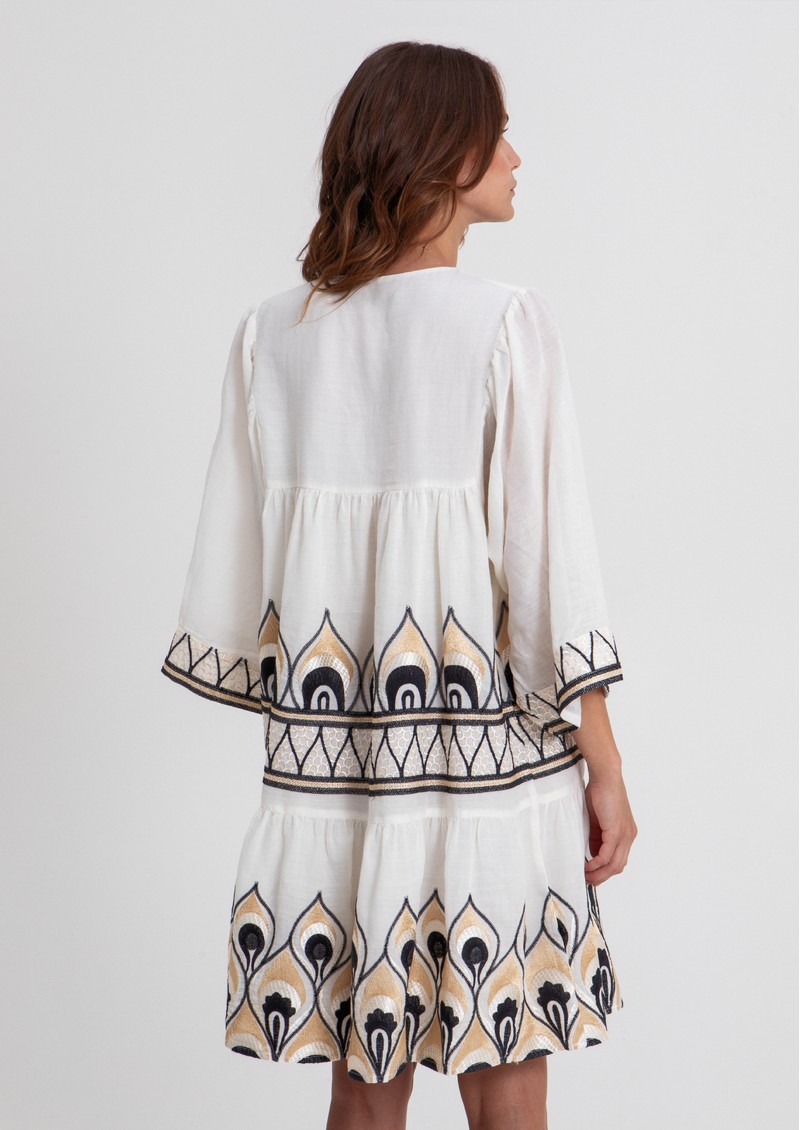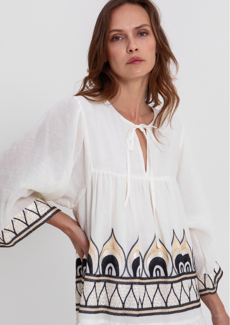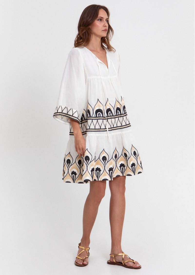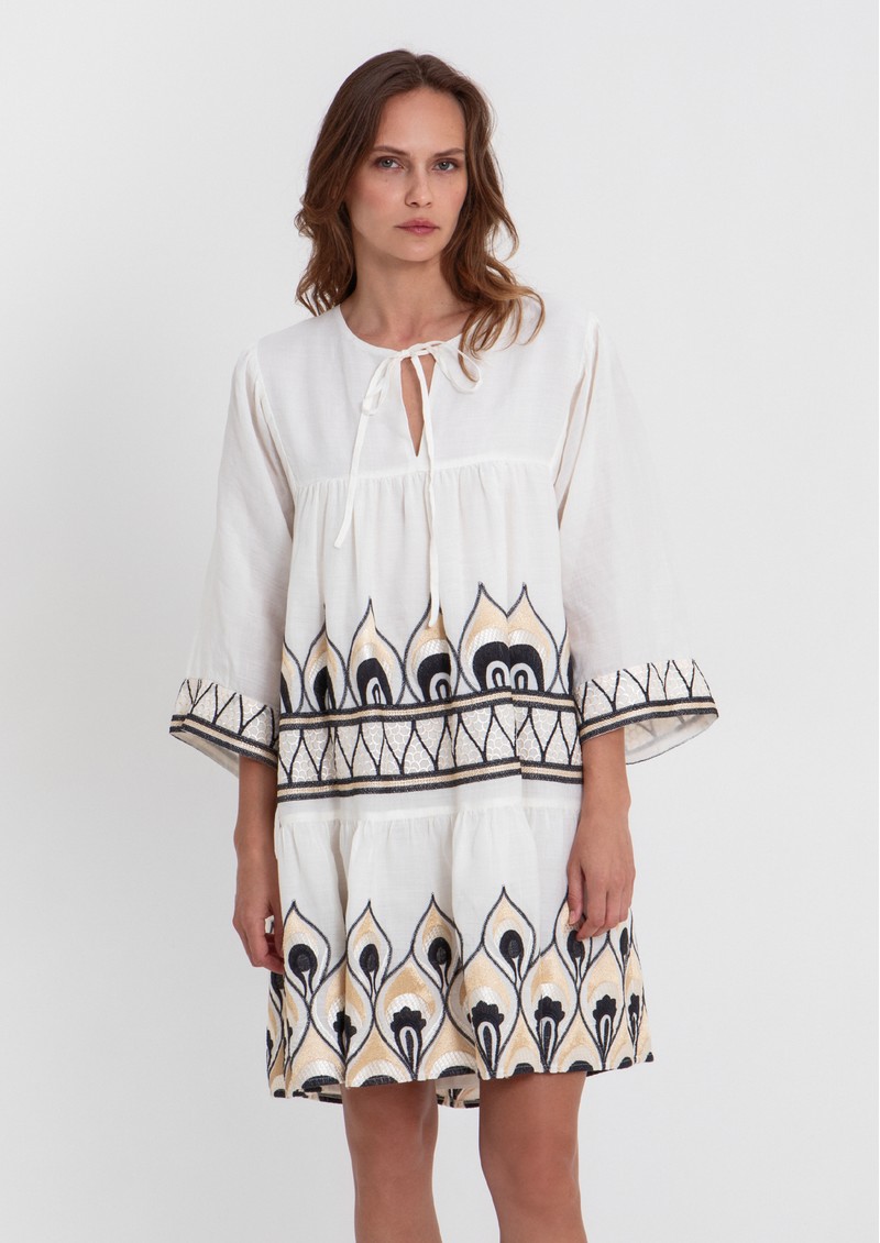 The Greek Archaic Kori Embroidered Mini Dress in white/black is crafted from ramie (a strong, lightweight, and breathable natural fibre with a smooth, linen-like texture). Featuring a tie-neck closure that can be worn open or closed, 3/4 length wide sleeves, a relaxed A-line fit, and tiered sections, it is adorned with intricate feather motif embroidery and falls to an above-knee length for a playful, elegant silhouette.