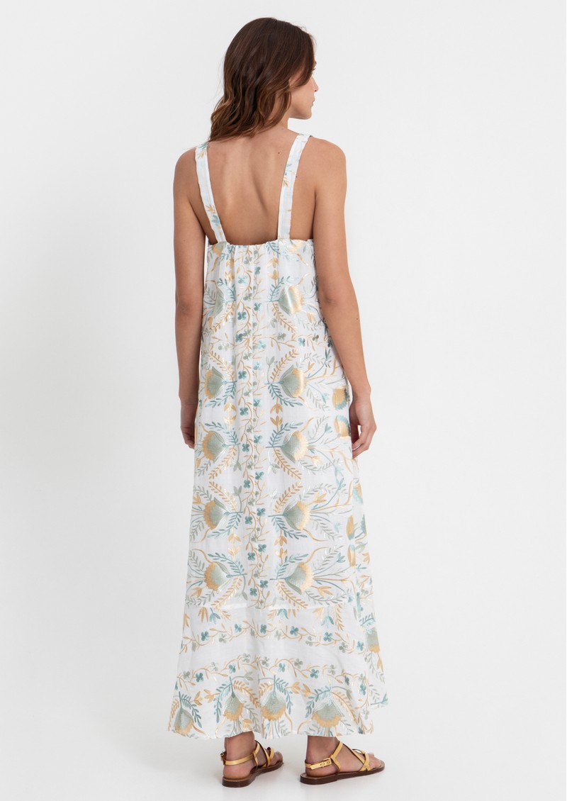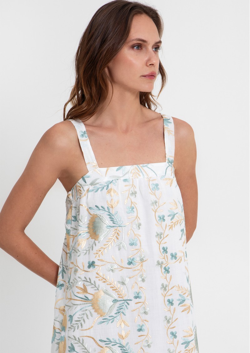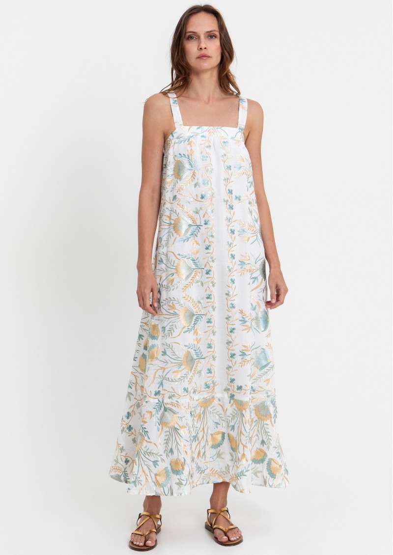 The Greek Archaic Kori Floral Embroidered Midaxi Dress in white/multi is crafted from ramie (a strong, lightweight, and breathable natural fibre with a smooth, linen-like texture) for comfortable, airy wear. Featuring wide straps, a straight neckline, and an A-line midaxi silhouette, it is adorned with intricate light blue and gold floral embroidery across a crisp white base for an elegant, eye-catching finish.
