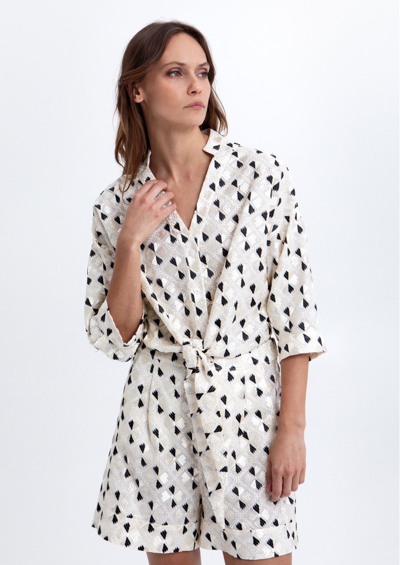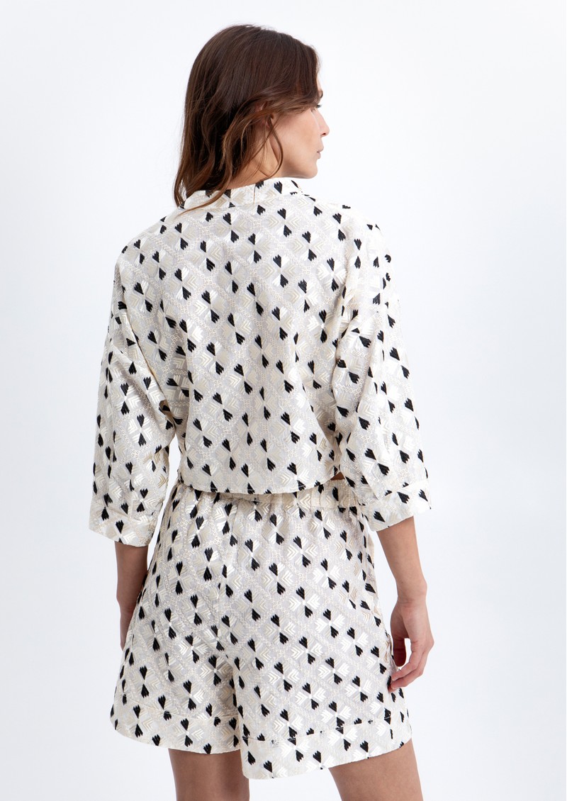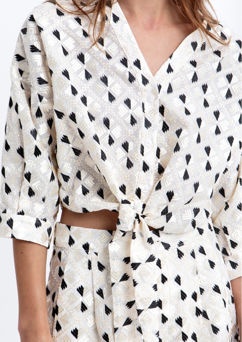 The Greek Archaic Kori Geo Embroidered Shirt in white/champagne is crafted from ramie for comfortable, airy wear. Featuring a V-neckline with a short collar, 3/4 length sleeves, intricate geometric embroidery all over, a button-front closure with a front tie, and a cropped length, it offers a stylish, contemporary silhouette.