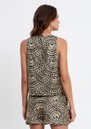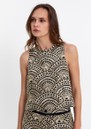 The Greek Archaic Kori Sleeveless Embroidered Cotton Top in black/gold is crafted from cotton (a soft, breathable natural fibre) for comfortable, everyday wear. Featuring a rounded neckline, sleeveless design, regular fit, and waist-length cut, it is adorned with gold fan motif embroidery all over for a stylish, statement finish.
