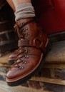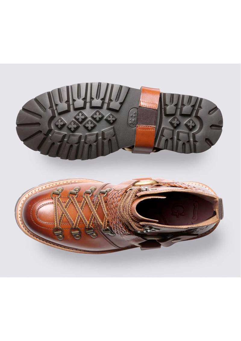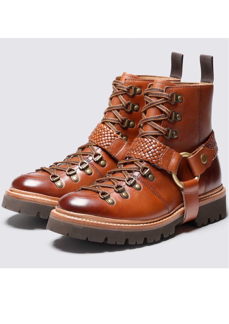 The Grenson x Holly Willoughby Nanette Handpainted Hiker Boot in Tan brings a fresh twist to an iconic favourite. Seven years after Holly wore the classic Nanette on I’m a Celebrity, she’s designed her own version: a tan handpainted leather boot on a chunky yet lightweight commando sole, featuring a detachable strap with elastic and handwoven “basketweave” leather details secured by brass O-rings and a popper. Goodyear welted for durability, this statement boot combines style, craftsmanship, and functionality.