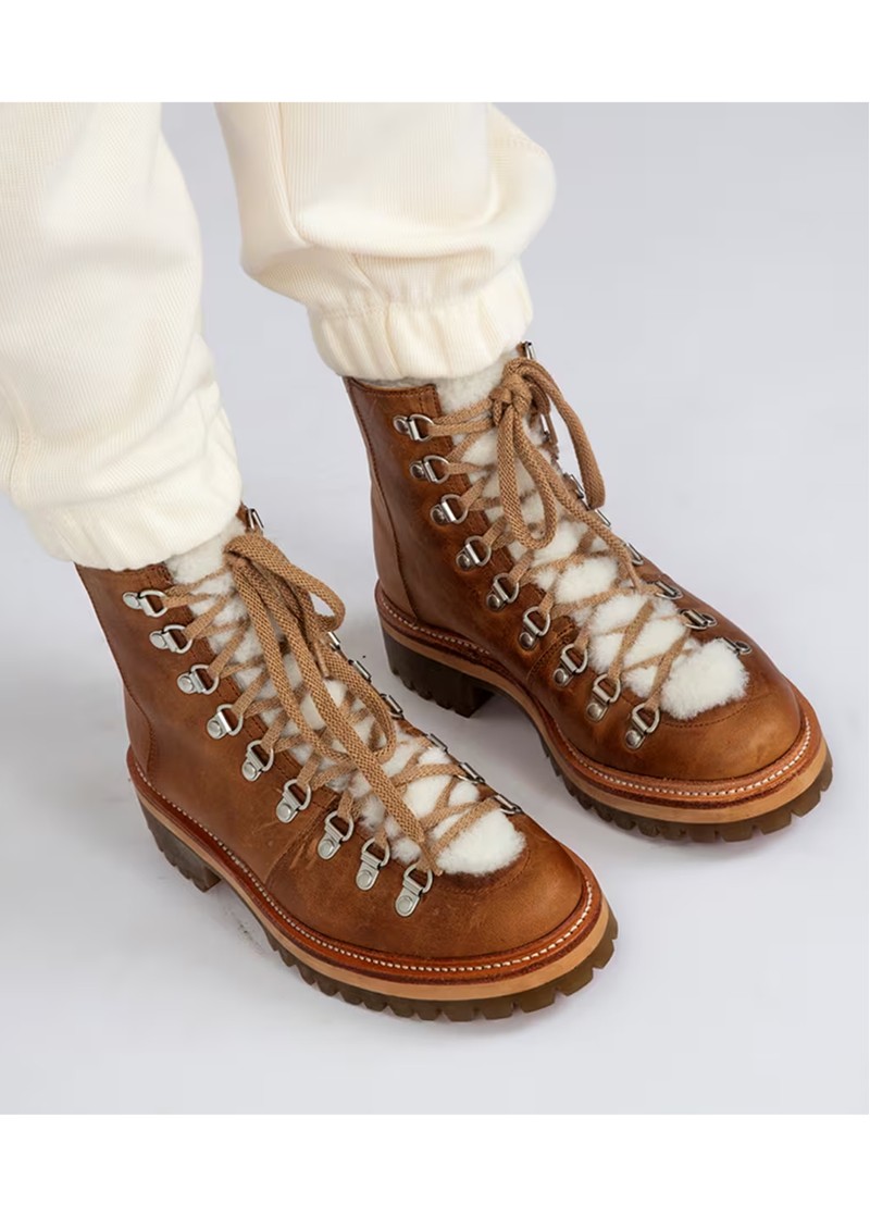 Introducing British Hertitage brand Grenson to The Dressing Room. This best selling Nanette Boot is their chunky, lightweight hiker boot. Designed in a luxurious natural heritage calf leather full white shearling lining inside. Other features of this Grenson shoe includes: