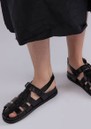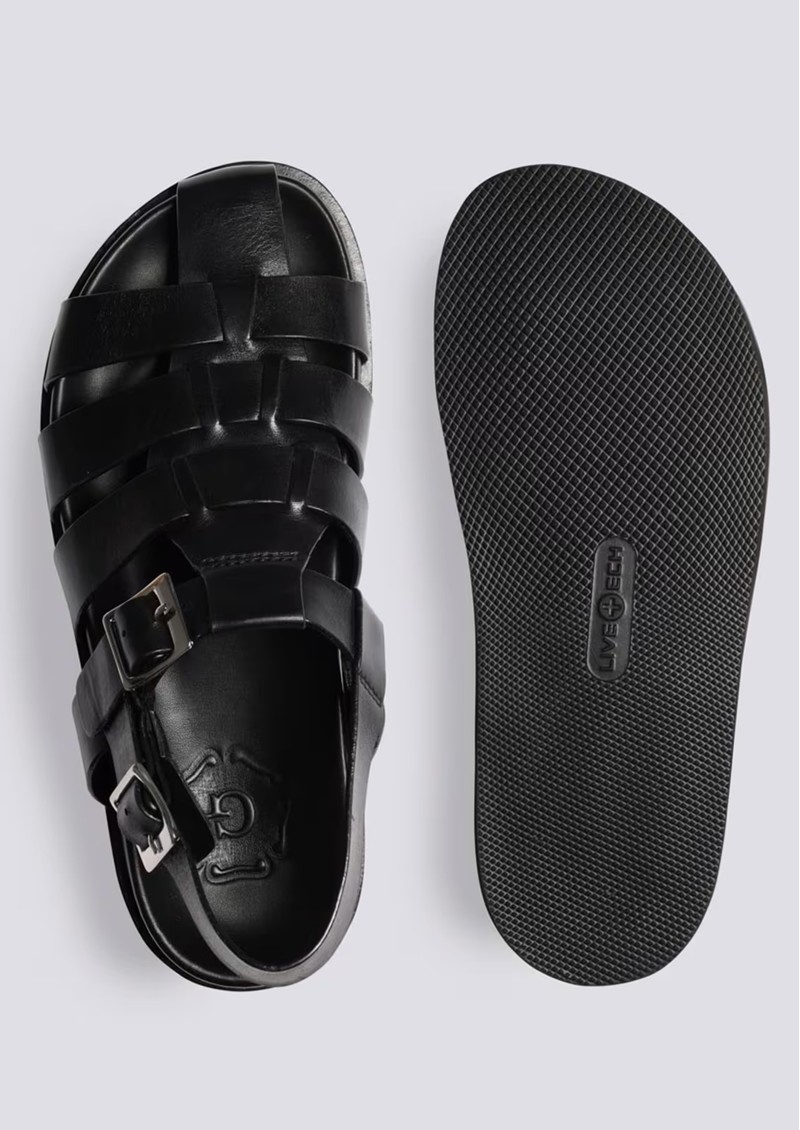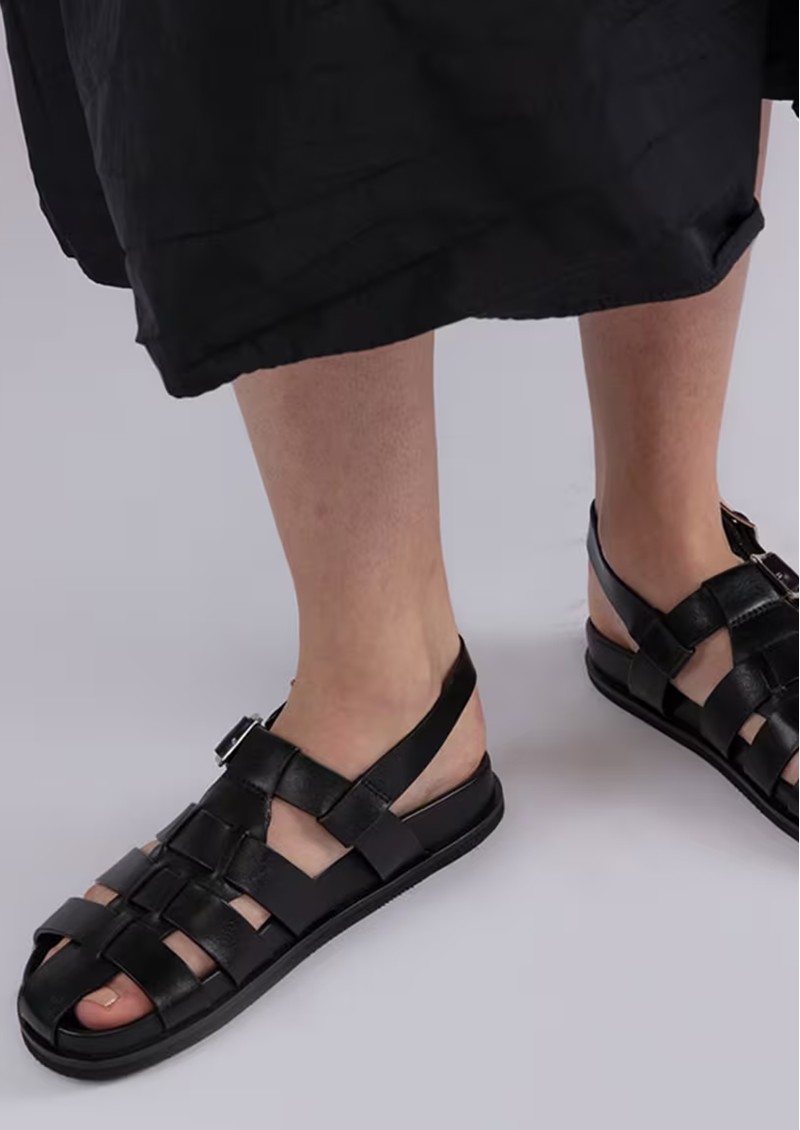 These sandals are crafted from a black calf leather we advise using a black cream or natural cream and buff up with a soft cloth for best results. This style isn't availale to be resoled due to the construction