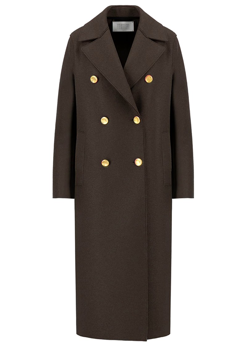 Say hello to the iconic Military Double Breasted coat from Harris Wharf. Designed in a deep brown pressed wool, featuring chic gold button detailing, and a sleek longline silhouette, this coat is a must-have autumn/winter essential!